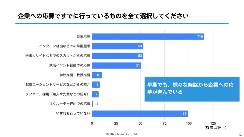 - 早期でも、様々な経路から企業への応募が進んでいる