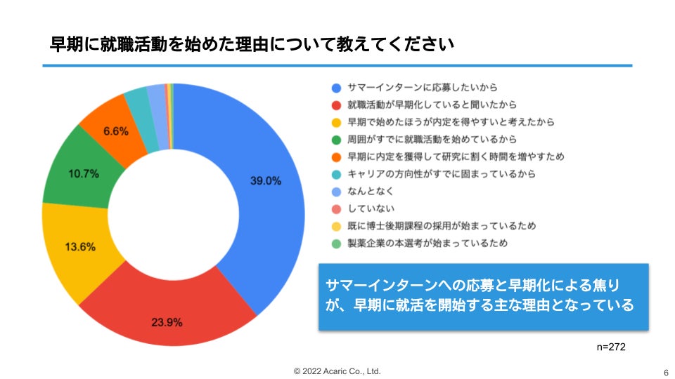 - サマーインターンへの応募と早期化による焦りが、早期に就活を開始する主な理由となっている