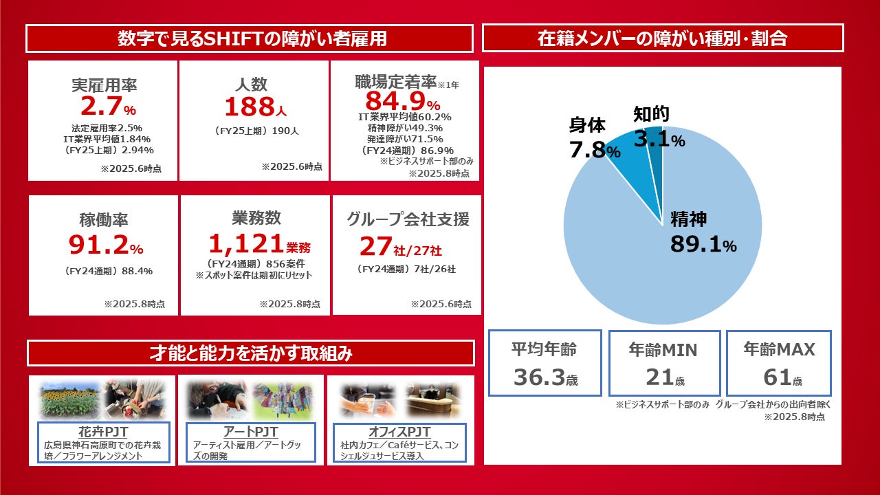 2015年から障がい者雇用を開始したSHIFTでは、2019年に発足した専門部署・ビジネスサポート部が「才能と能力を活かして、みんなが活躍できる社会の実現」をミッションに掲げて、障がいのある従業員の採用と活躍機会の創出に取り組んでいます。また、SHIFTグループ全社での障がい者雇用も積極的に推進しており、2025年6月には、障がいのある従業員の常用雇用が求められている、従業員数40人以上の全グループ会社27社において法定雇用率を超える実雇用を実現しました。