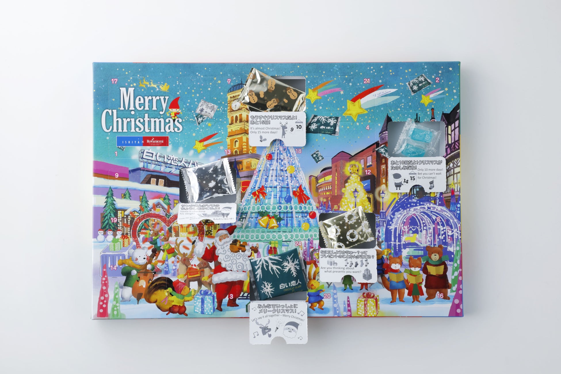 「白い恋人」をはじめ、イシヤのいろいろなお菓子が楽しめるサンタクロースと愉快な仲間たちがデザインされたアドベントカレンダー。12月1日から毎日1つずつ蓋を開けて、お菓子を楽しみつつ、待ち遠しいクリスマスまでカウントダウンができる、毎年大人気の商品です。