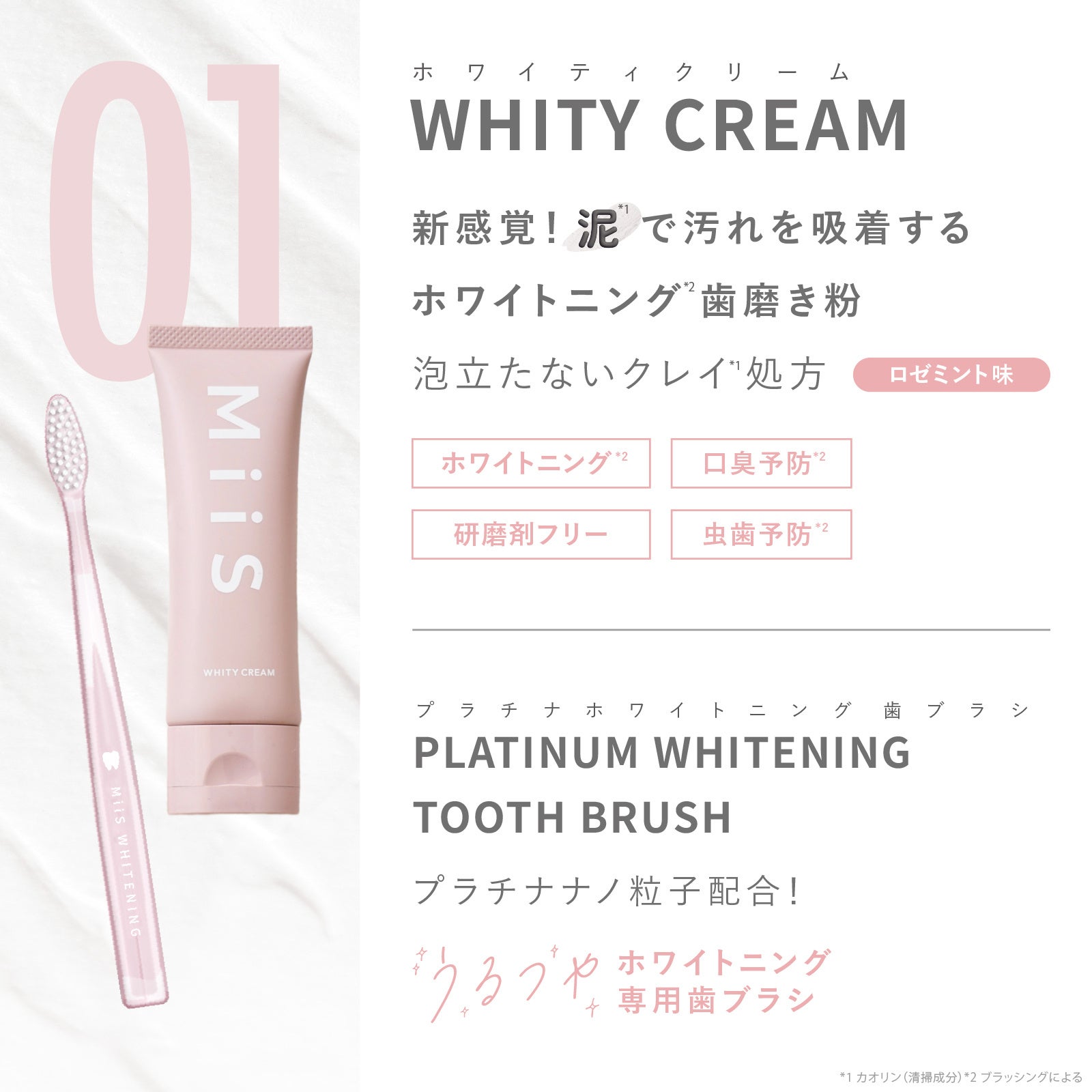 MiiSの代表商品である歯の美容液「ホワイティエッセンス」をはじめ、口内環境を整えるマウスウォッシュ「ブレスエッセンス」、9月1日に発売した「ホワイティクリーム」、ホワイトニング専用歯ブラシ「プラチナホワイトニング歯ブラシ」をセットにしました。ピンクのグラデーションと木漏れ日をイメージした限定BOXでお届けいたします。