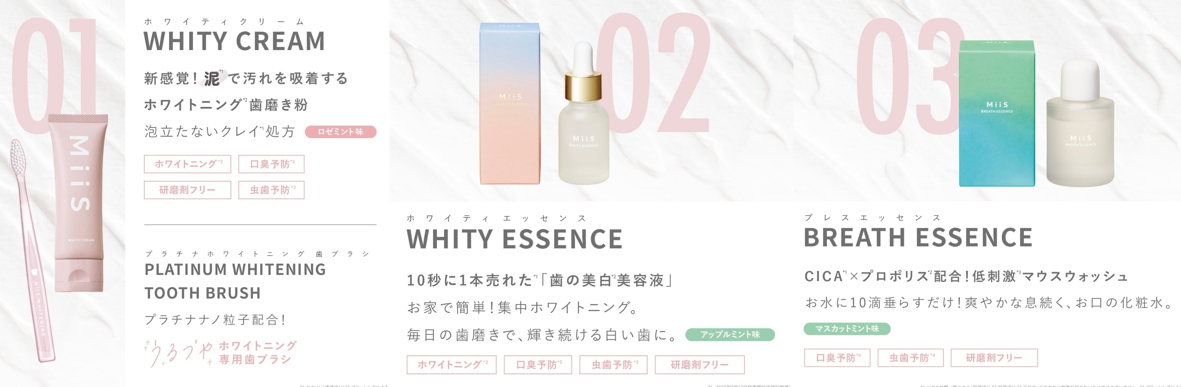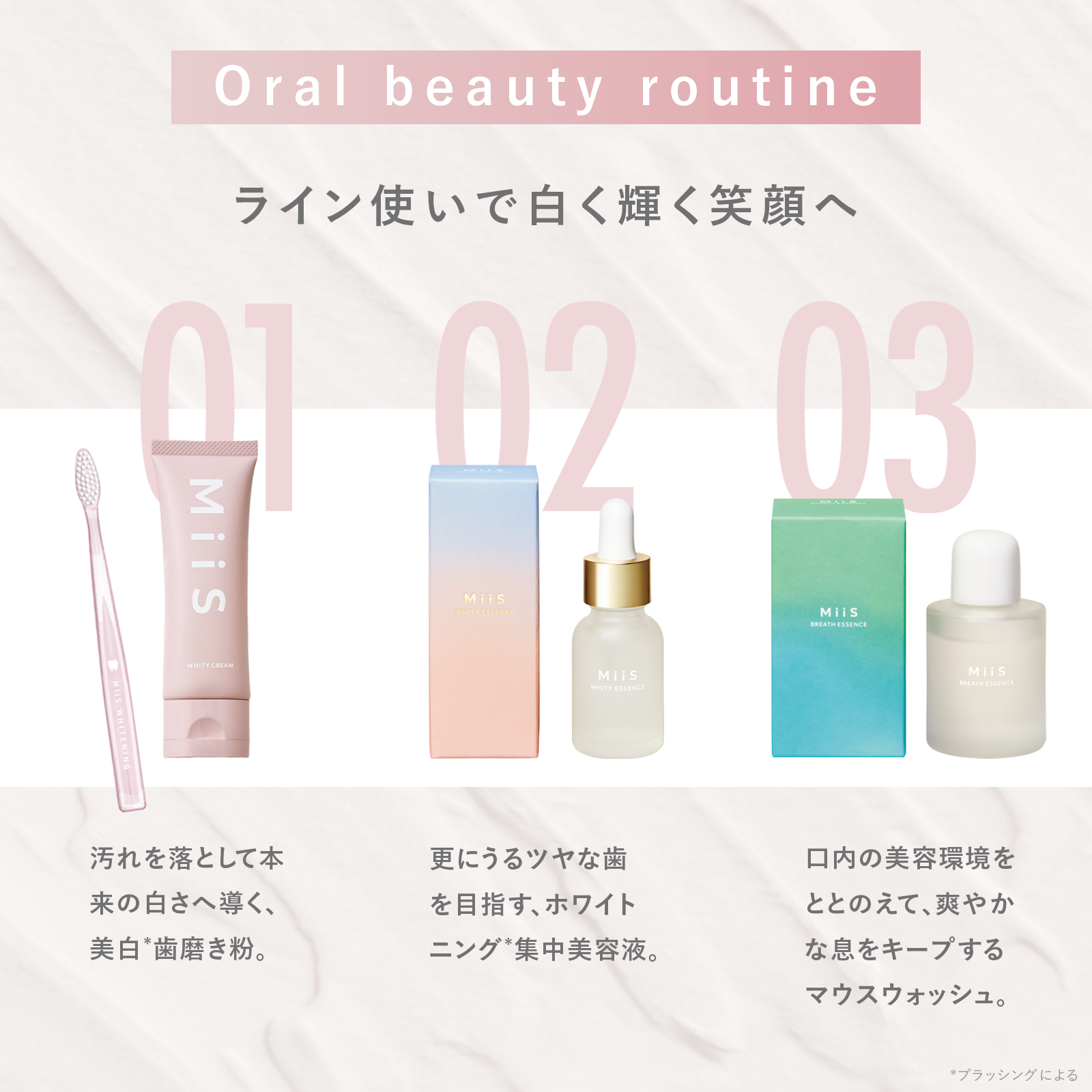 MiiSは、「オーラル美容を広めて、人々の人生を輝かせるエッセンスになる」というミッション実現に向け、商品の見た目だけでなく、成分にも徹底的にこだわり続け、歯も、息も、笑顔も、みなさんの輝く瞬間をつくるあたらしい美の習慣「オーラル美容」を提案しています。