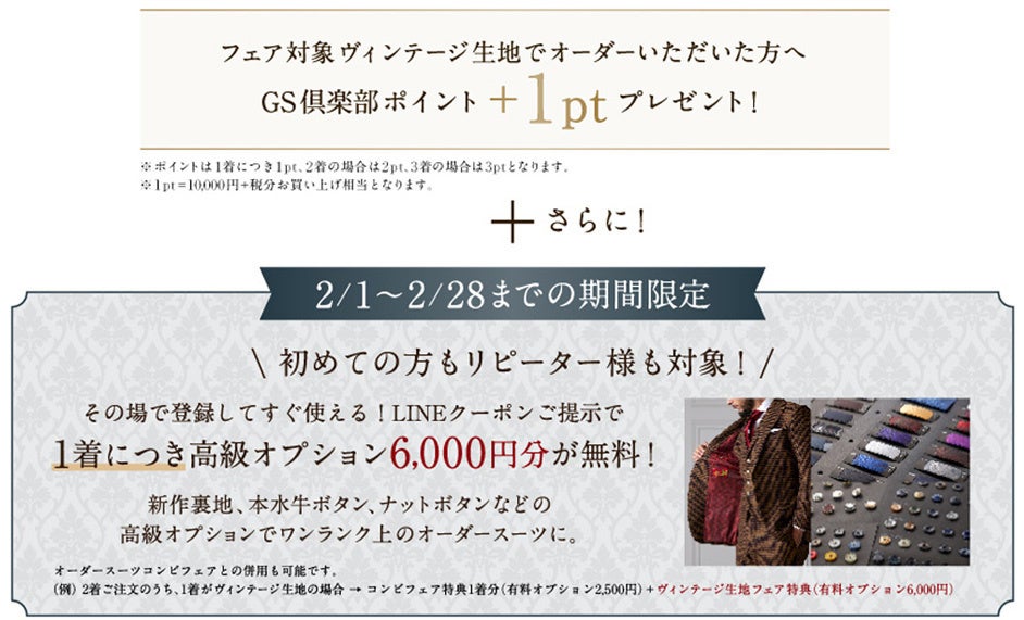 更に、対象期間中は対象生地1着につきGS倶楽部ポイントを+1ポイント(10,000円お買い上げ相当分)進呈させていただきます。
