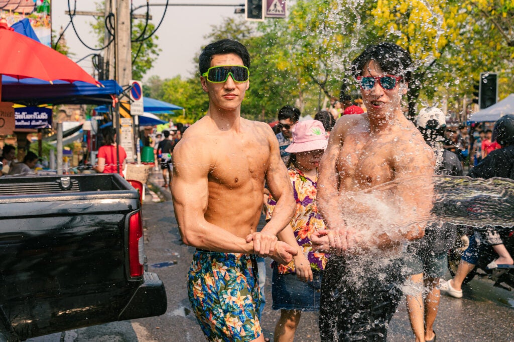 マッチョたちの筋肉に水をぶっかけましょう!一部水鉄砲やバケツ等をご用意しております。