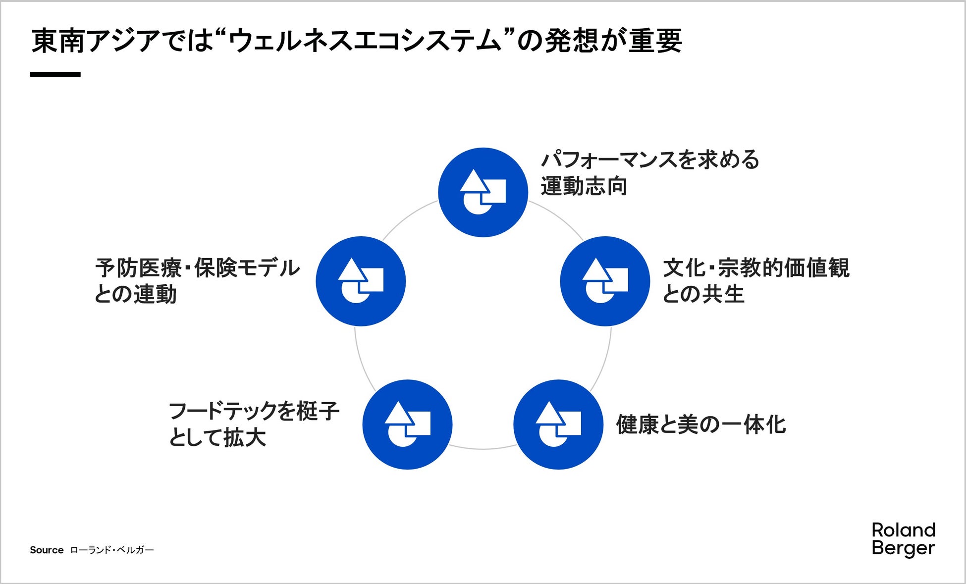 欧州最大級の経営戦略コンサルティングファームである株式会社ローランド・ベルガー(以下、ローランド・ベルガー)は、12月22日、コロナ禍以降「医療に頼り切るのではなく、自らの健康は自らで守るべきだ」という意識が急激に加速した東南アジアのウェルネス市場について、食品メーカーや健康食品を取り扱う流通・小売事業者が直面する市場環境の変化を整理し、今後の構造変化を見据えた戦略的示唆を提示レポート「東南アジア ウェルネス市場レポート」を発表しました。
