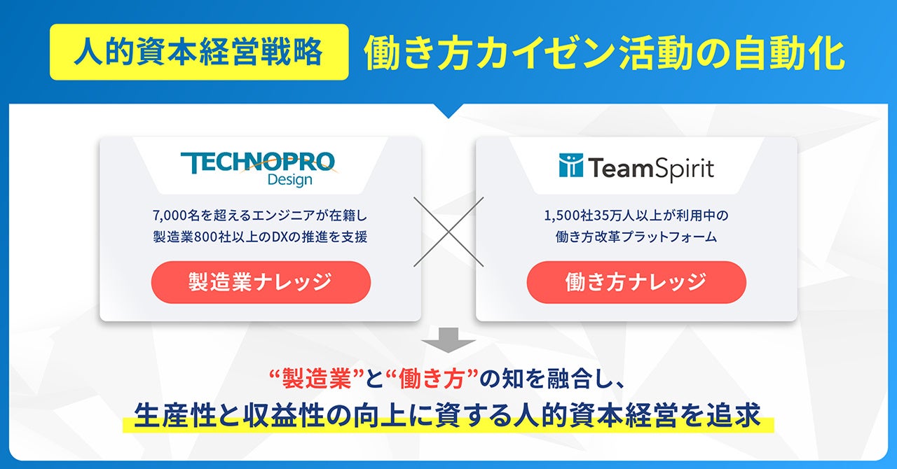 株式会社テクノプロ テクノプロ・デザイン社(本社:東京都港区、代表取締役カンパニー社 長:嶋岡 学、以下「テクノプロ・デザイン社」)と働き方改革プラットフォーム 「TeamSpirit」シリーズを開発・提供する株式会社チームスピリット(代表取締役:荻島 浩司、 以下「 チームスピリット」)は、製造業に向けたDX推進を目的とし、「TeamSpirit」の販売・ 導入・利活用支援サービスの提供を通じたHRTech領域における共同ビジネスを2022年5月23日 より開始したことをお知らせいたします。