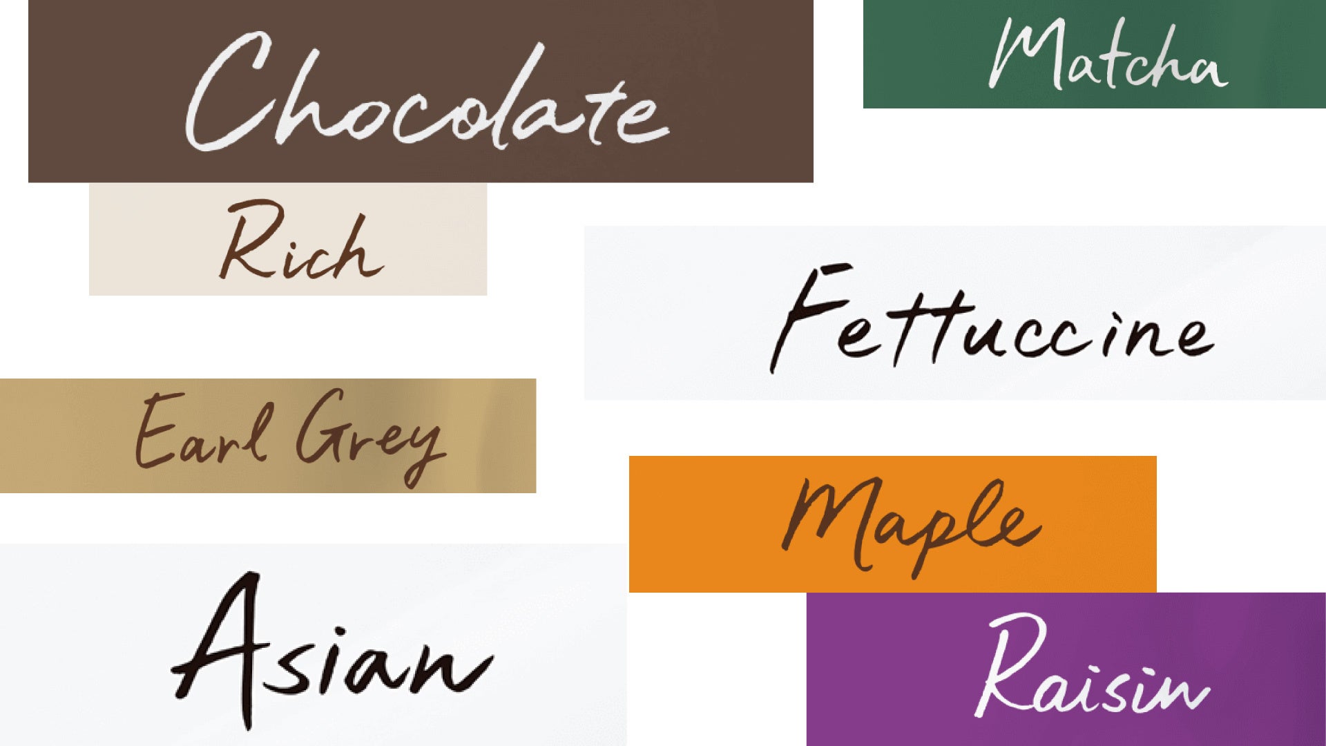 今回のデザインリニューアルでは、各商品名の表記に、当社社員による手書きデザインを採用しています。商品毎に担当したメンバーは異なり、それぞれの想いと個性がデザインで表現されています。