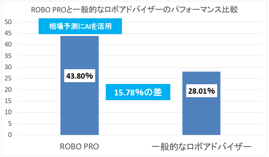 FOLIOでは、人を凌駕するパフォーマンスを目指す資産運用サービスとして、運用プロセスに人が介在せずAIが相場を予測して運用を行う「ROBO PRO」(※1)を2020年1月にリリースし、以降3年以上に渡って「AI投資」のノウハウを蓄積してきました。ROBO PROがリリースを開始した2020年1月15日から2023年3月31日の期間でのパフォーマンスは+43.8%となっており、一般的なロボアドバイザーを15.78%上回る実績が出ています。(※2,3,4)