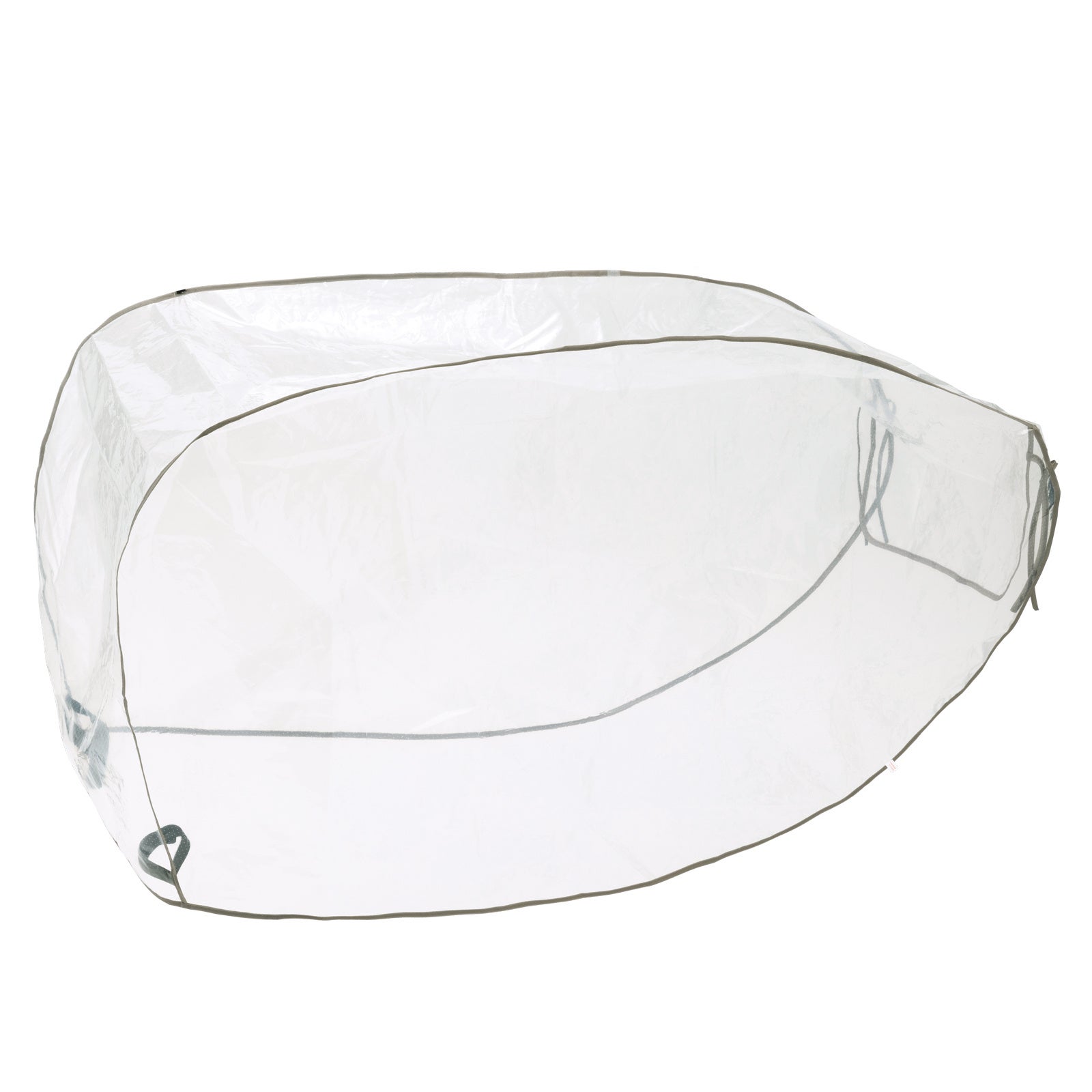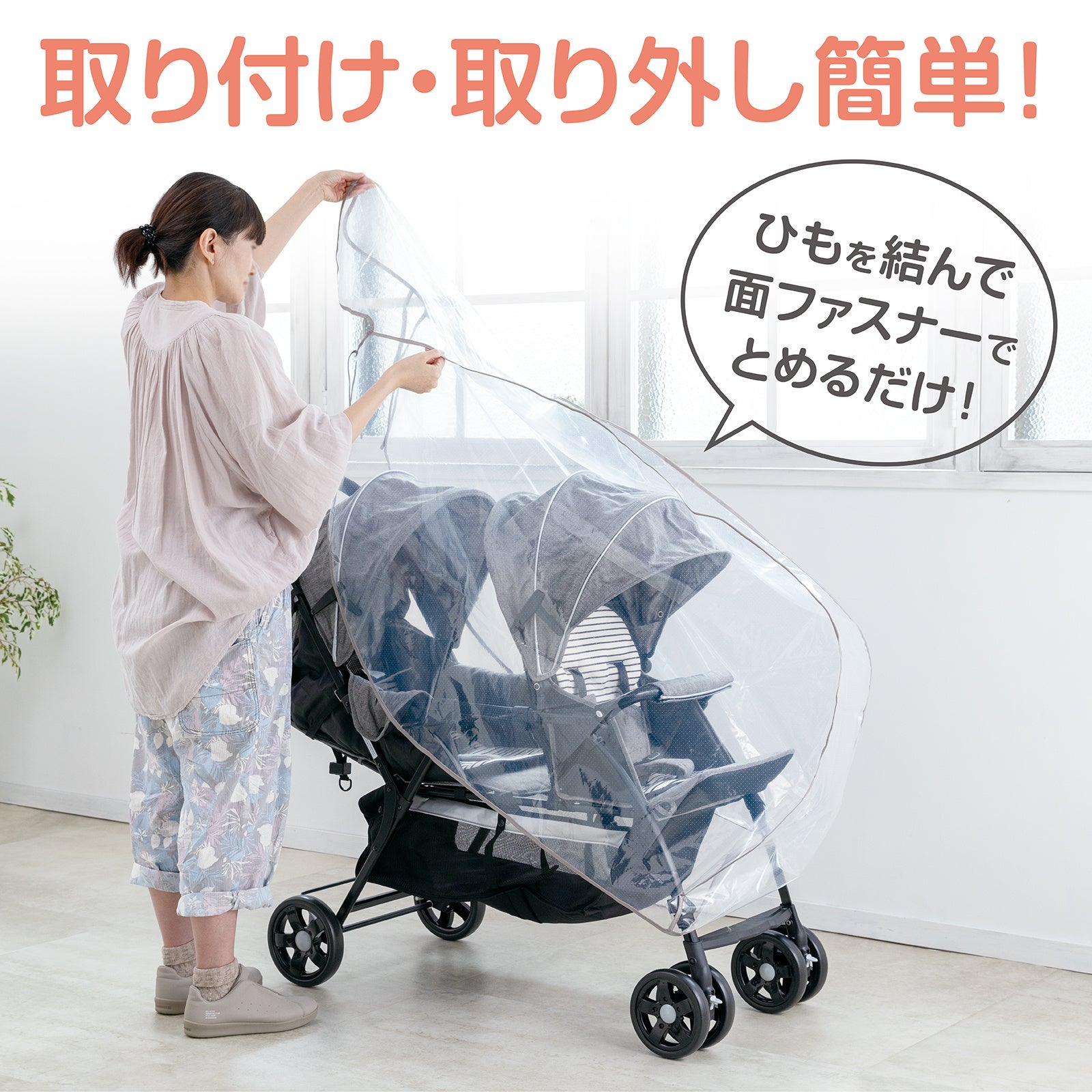 面ファスナーで簡単着脱できる、縦型2人乗りベビーカー専用のレインカバーです。取り付けたままでも赤ちゃんの乗せ降ろしが可能です。