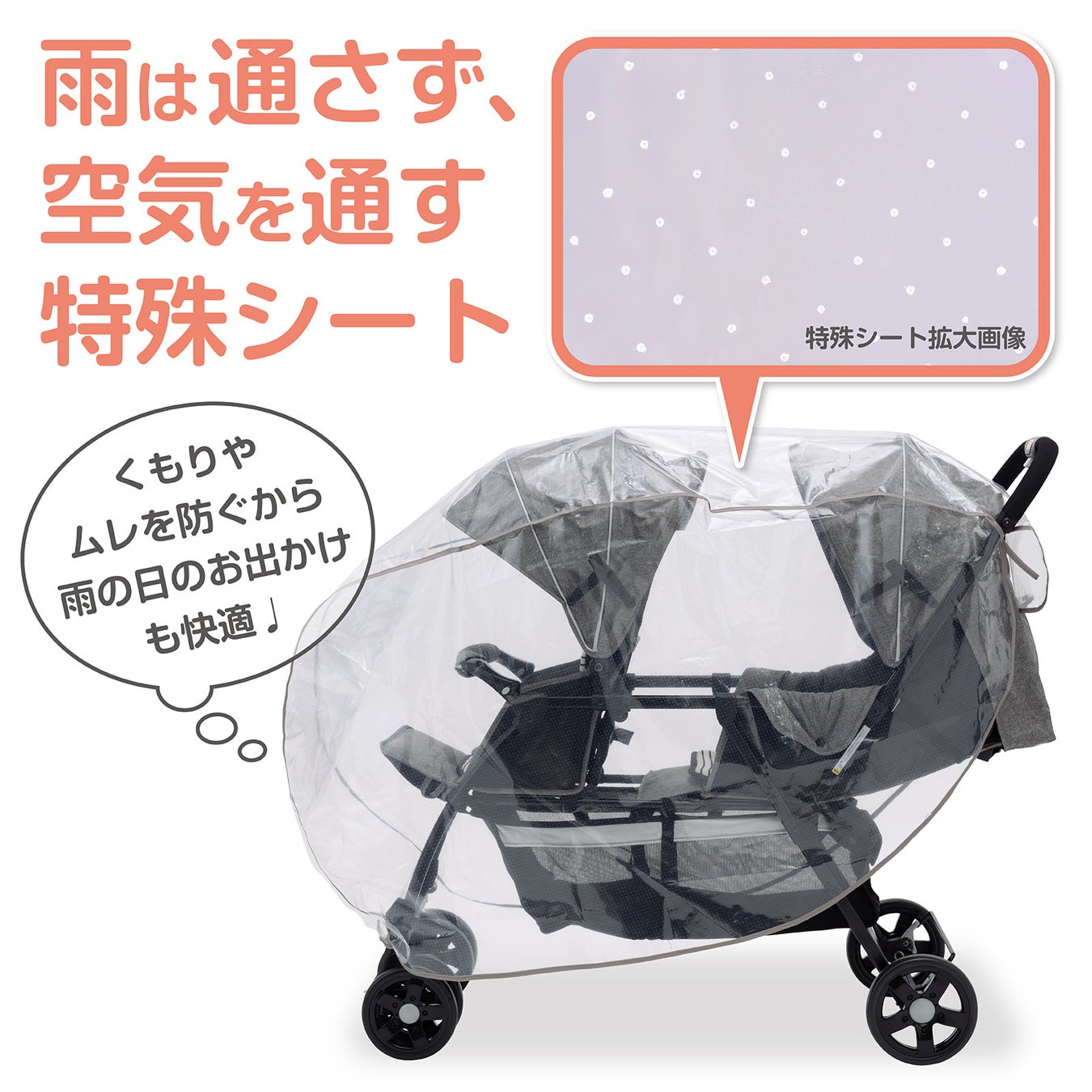 雨を通さず空気は通す曇らない特殊シートで視界良好『2人乗りベビーカー用レインカバー』を発売