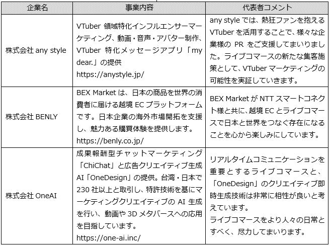 NTTスマートコネクトは、本日採択した共創パートナー3社と、ライブコマースプラットフォームを活用した共創に向けて詳細検討を行い、2024年度中に実証実験を予定しています。
