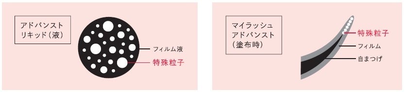 独自のマスカラフィルム液「アドバンストリキッド」は、センイの50~500分の1の特殊粒子3種を混合して配合。粒子が連結することで、ダマ束なく毛先をすっと伸ばします。まつげ1本1本をコーティングすることで、センイ無配合なのに、自分のまつげがそのまま長くなったような、自然で美しい目もとが完成します。