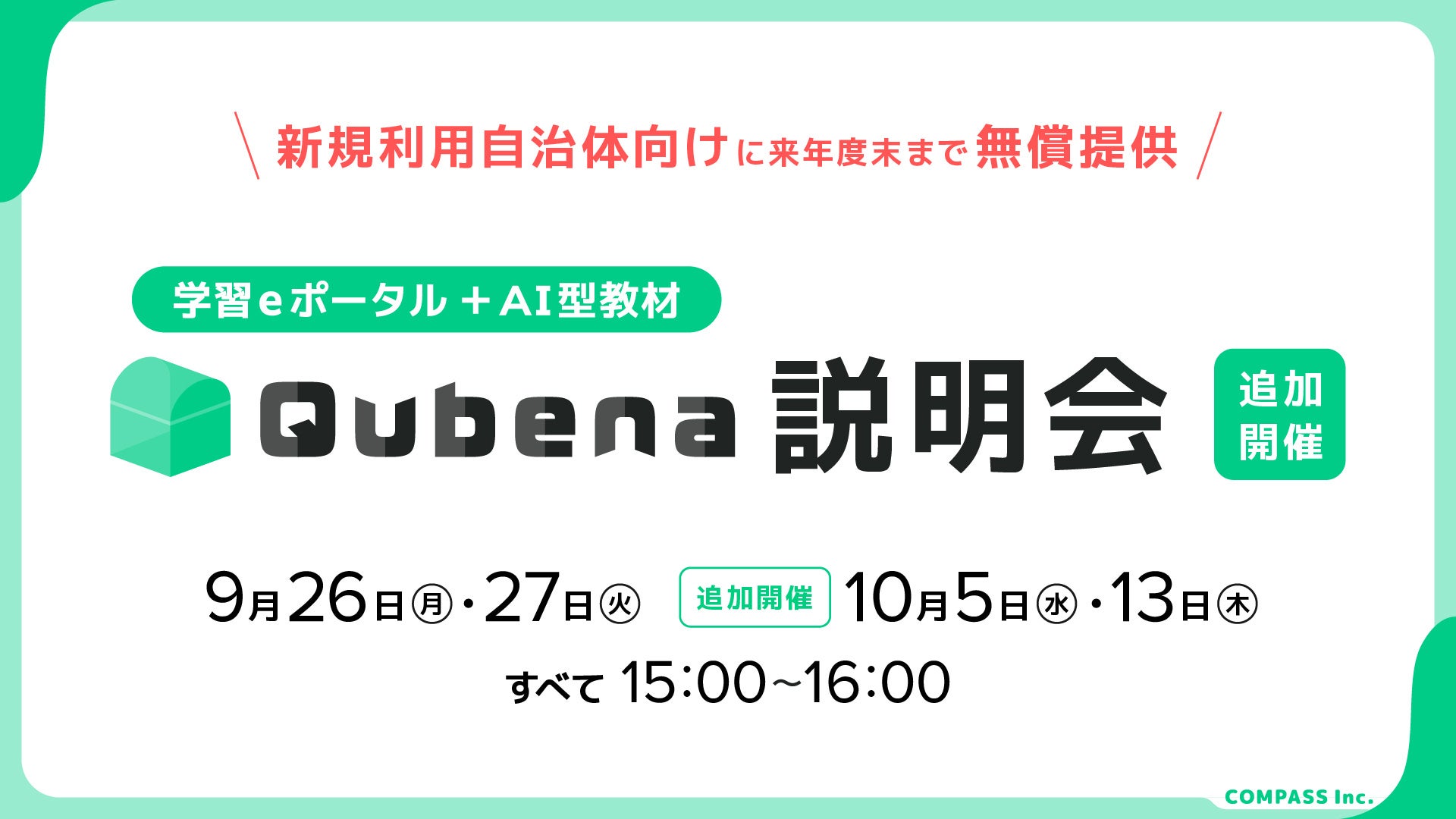 COMPASSでは先日発表いたしました通り、令和5年度の全国学力学習状況調査の一部がMEXCBTで実施されるにあたり、全国の自治体で導入が必要とされる学習eポータルの導入/活用推進支援として、学習eポータル+AI型教材「Qubena」の無償提供を2024年3月までの間、新規利用自治体を対象に行っております。そのオンライン説明会について、おかげさまでお申し込み多数につき、このたび10月の追加開催を決定いたしましたので、ぜひ説明会へご参加の上、この機会に導入をご検討ください。