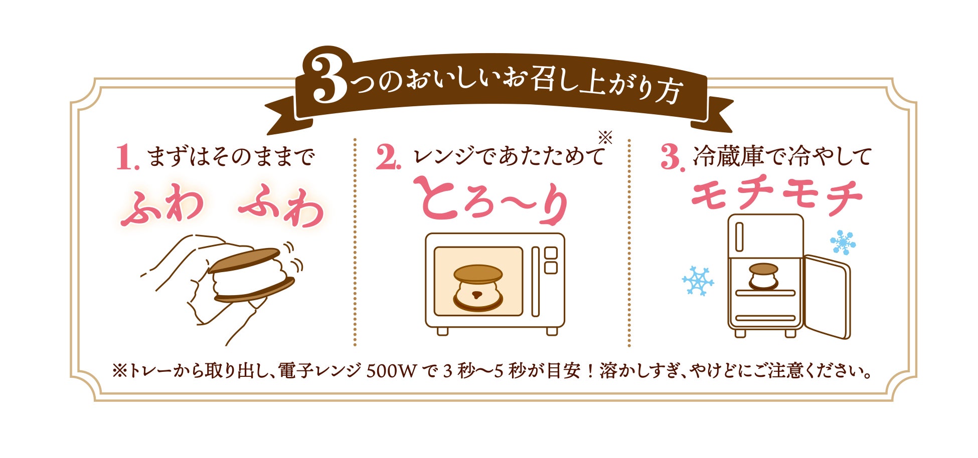 『焼マシュマロサンド・ベイクドマロウ』にはおすすめの食べ方が 3 通りあります。一つ目は、常温のままで食べる方法です。自家製マシュマロの“ふわふわ”な食感をお楽しみください。二つ目は、温める方法です。電子レンジで少し温めることで、マシュマロが“とろ〜り”ととろけます。三つ目は冷やす方 法です。食べる直前に冷蔵庫で冷やすことで、マシュマロが “モチモチ”とした食感になります。今の暑い季節には、三つ目の冷やして食べる方法がアイスのようにひんやりとし、特におすすめです!食べる温度で食感が変わる、世にも珍しい“焼マシュマロサンド”をぜひ食べ比べてみてください。