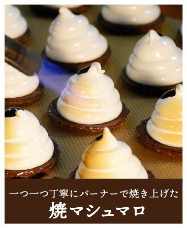 片面をチョコレートでコーティングした香ばしいグラハムクッキーで、なめらかなチョコレートが入った自家製のふわふわマシュマロをサンドしました。焼マシュマロは、一つ一つ丁寧にバーナーで焼き上げることで、食欲をそそる“ツヤ”が現れ、香ばしい香りが立ち込めます。その見た目と香ばしさに心惹かれ、思わずほおばると身も心も満たされる自慢の焼マシュマロスイーツです。