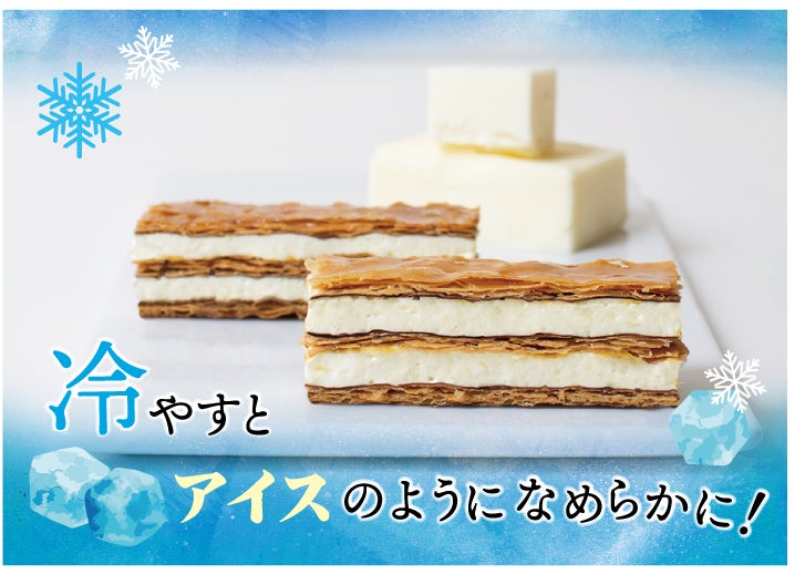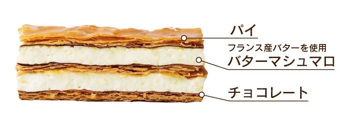 パイとマシュマロを組み合わせた『バターマシュマロミルフィーユ』。バター100%を使用したパイを160層に折り重ね焼き上げ、表面をキャラメリゼしました。さらに片面にチョコレートをコーティングし、仕上げにフランス産バターを練り込んだ自家製マシュマロと重ね合わせました。サクサクとしたパイとふわふわのマシュマロに加え、ふわっと広がるバターの香り。しっとり濃厚なくちどけをお楽しみいただけます。一段と美味しくなるおすすめの食べ方は、“冷やす”ことです。食べる前に冷やしていただくことで、チョコレートが“パリッ”、バターマシュマロの食感は“もっちり”、くちどけはまるでアイスを食べているかのようになめらかな味わいに。暑い季節にこそ、ぜひお試し下さい。