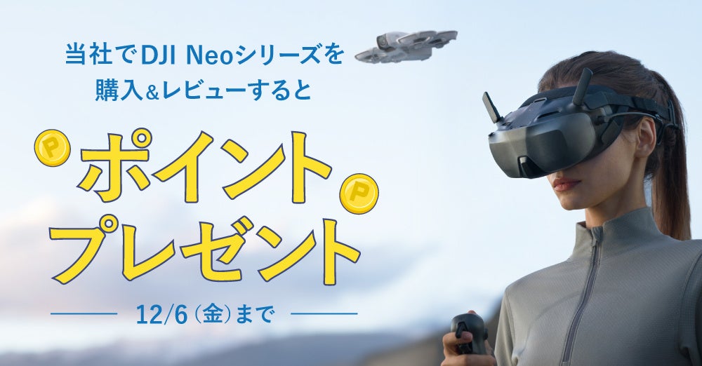 対象期間中にシステムファイブでDJI Neo Motion Fly More Comboをご購入いただき、商品を実際にお使いいただいた感想を必須条件を満たす形でレビュー投稿いただくと、採用時に次回のお買い物でご利用いただけるポイントを最大2,000円分(2,000ポイント)プレゼントいたします。