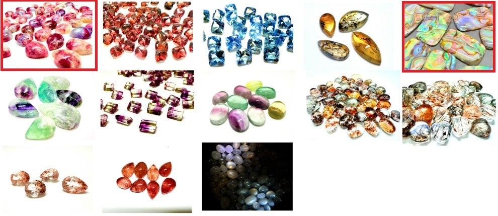 左上からユニコーンストーン、ガーネット、アクアマリン、デンドリッククォーツ、アバロンシェル、エンジェルフローライト、バイカラーフローライト、フローライト、ガーデンクォーツ、エピドートインクォーツ、レピドサイトインクォーツ、ピンクエピドート、ムーンストーンとなります。