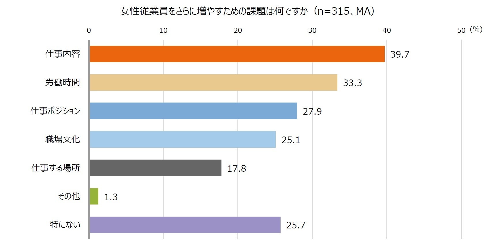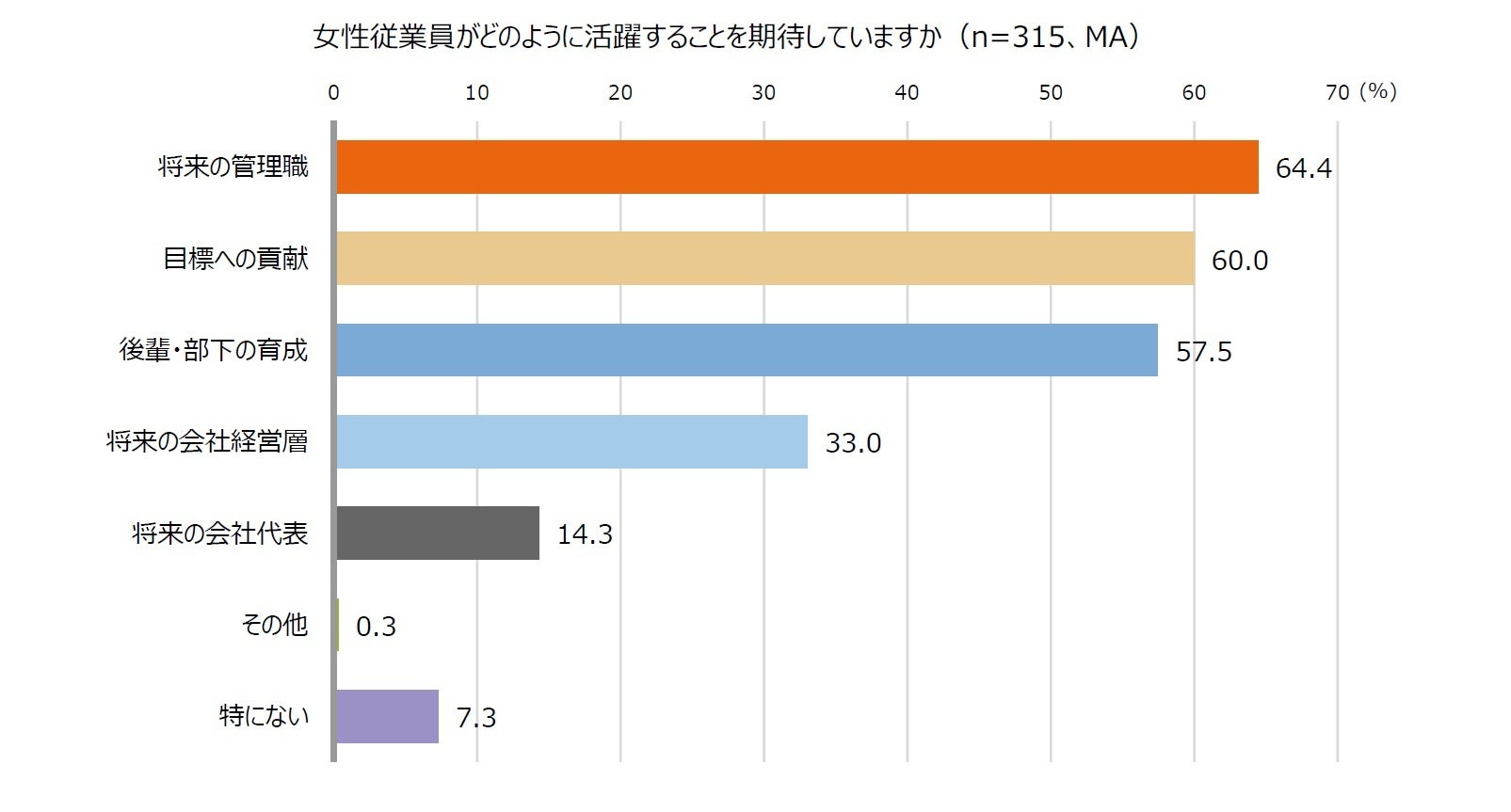 自社の女性従業員に期待することを聞いたところ、最も高かったのは、「将来の管理職」(64.4%)で、次いで、売上達成など部署の「目標への貢献」(60.0%)、「部下・後輩の育成」(57.5%)、「将来の会社経営層」(33.0%)となりました。目標達成や、部下・後輩育成などの部署の中心的な役割や、管理職、そして会社経営層になることを期待している経営者がいることがうかがえます。