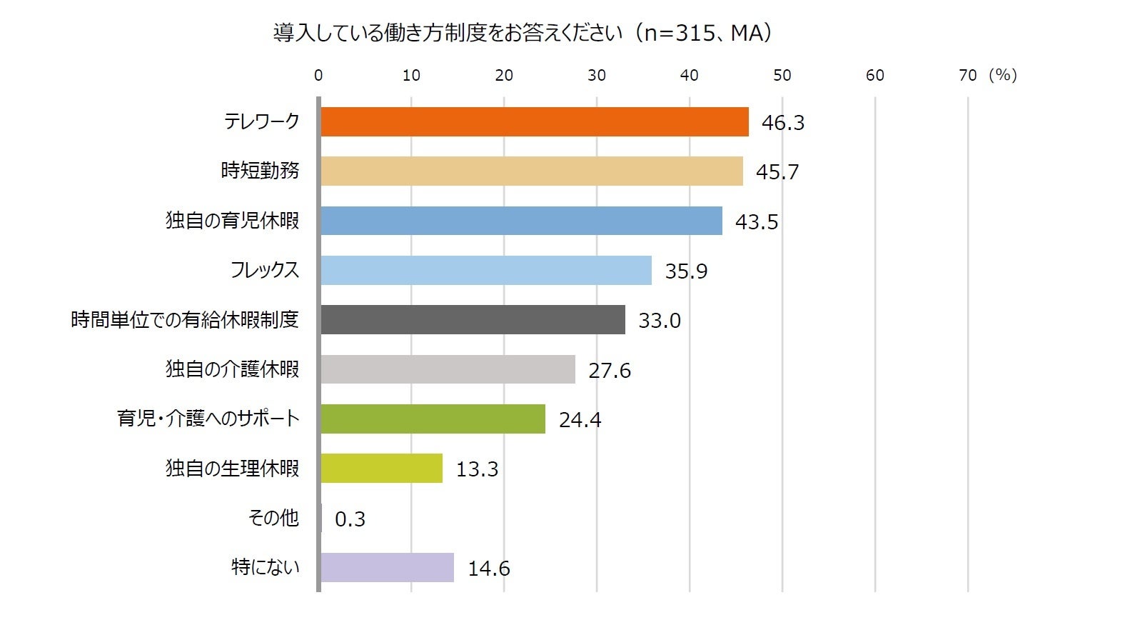 - 導入している働き方制度は、「テレワーク」(46.3%)が最多で、続いて「時短勤務」(45.7%)。多様な働き方のために必要なものとして最も高いのは、「ゆとりある人員配置」で、およそ半分(49.8%)
