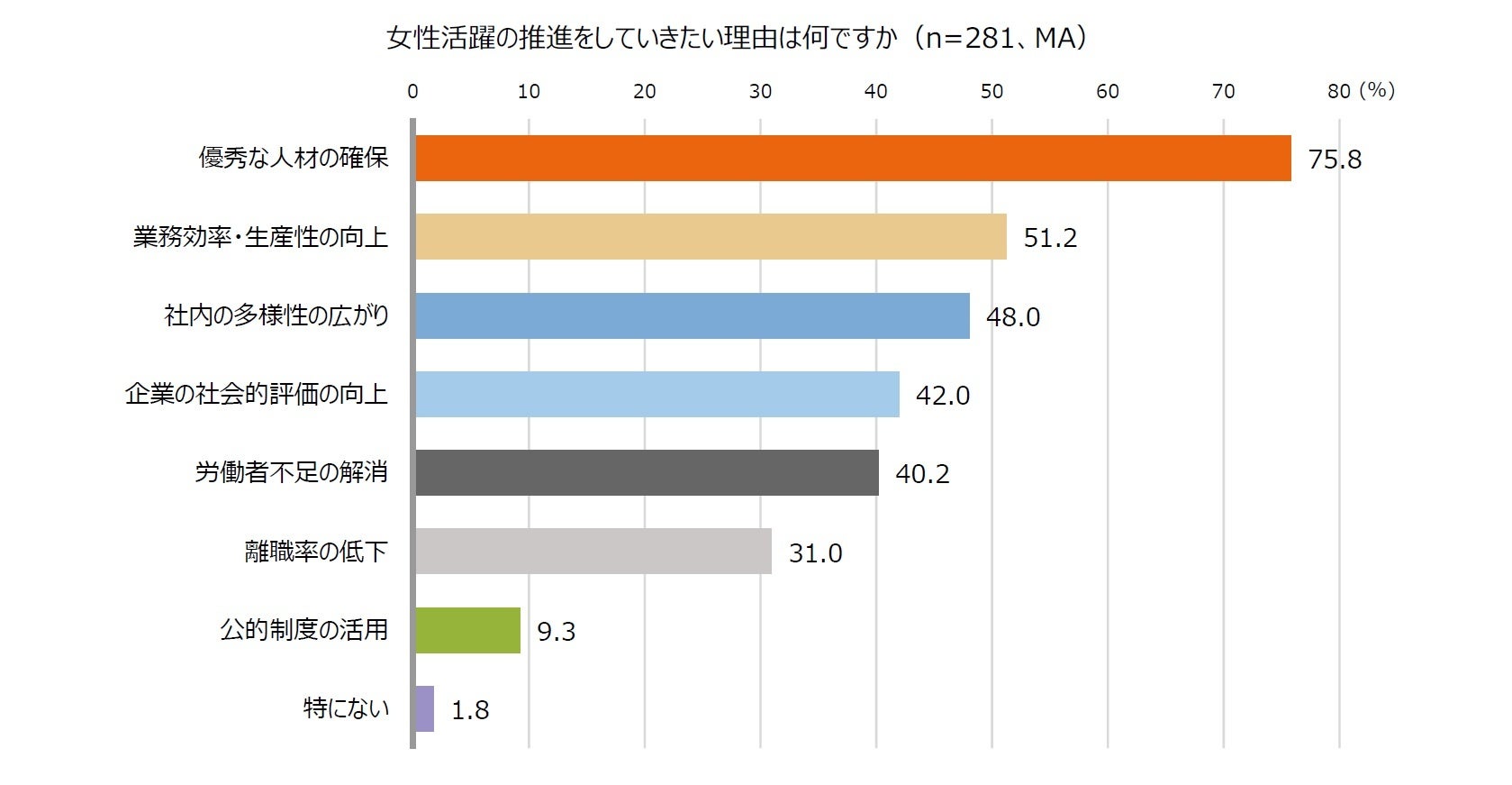 - より一層の女性活躍推進について、9割近い経営者が「推進したい」と回答。理由としては、「優秀な人材確保」が最多(75.8%)
