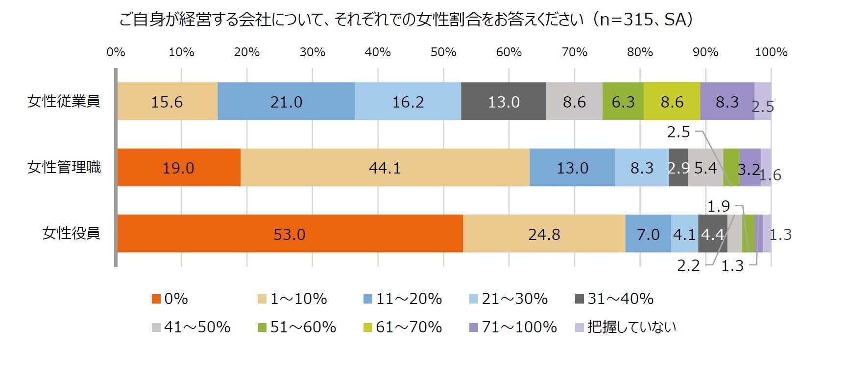 中小企業経営者315名に、自社の従業員のうちの女性割合を聞いたところ、最も高いのは「11~20%」で21.0%、次いで「21~30%」(16.2%)、「1~10%」(15.6%)となりました。管理職における女性割合については、最も高いのが「1~10%」(44.1%)で、次いで「0%」(19.0%)となり、役員における女性割合では「0%」が最多の53.0%、次いで「1~10%」(24.8%)でした。
