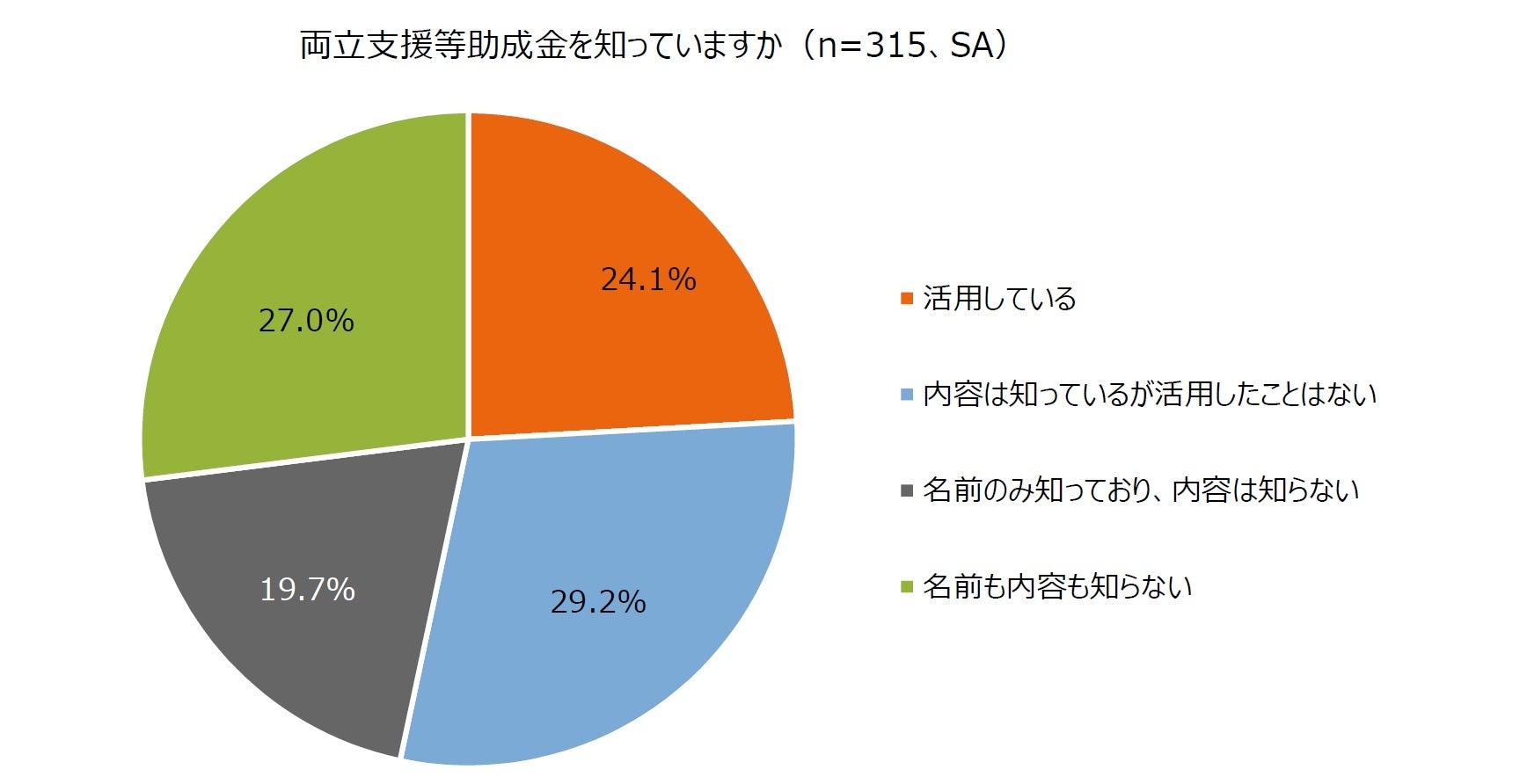 また、職場と家庭を両立できる“職場環境づくり”の取り組みを厚生労働省が支援する「両立支援等助成金」について聞いたところ、「活用している」は24.1%となった一方で、「内容は知っているが活用したことはない」(29.2%)、「名前のみ知っており、内容は知らない」(19.7%)、「名前も内容も知らない」(27.0%)でした。