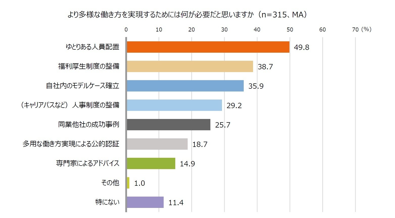 今後、より多様な働き方を実現するために必要なことを聞いたところ、「ゆとりある人員配置」が最も高く、約半分(49.8%)となり、次いで「福利厚生制度の整備」(38.7%)、「自社内のモデルケース確立」(35.9%)となりました。