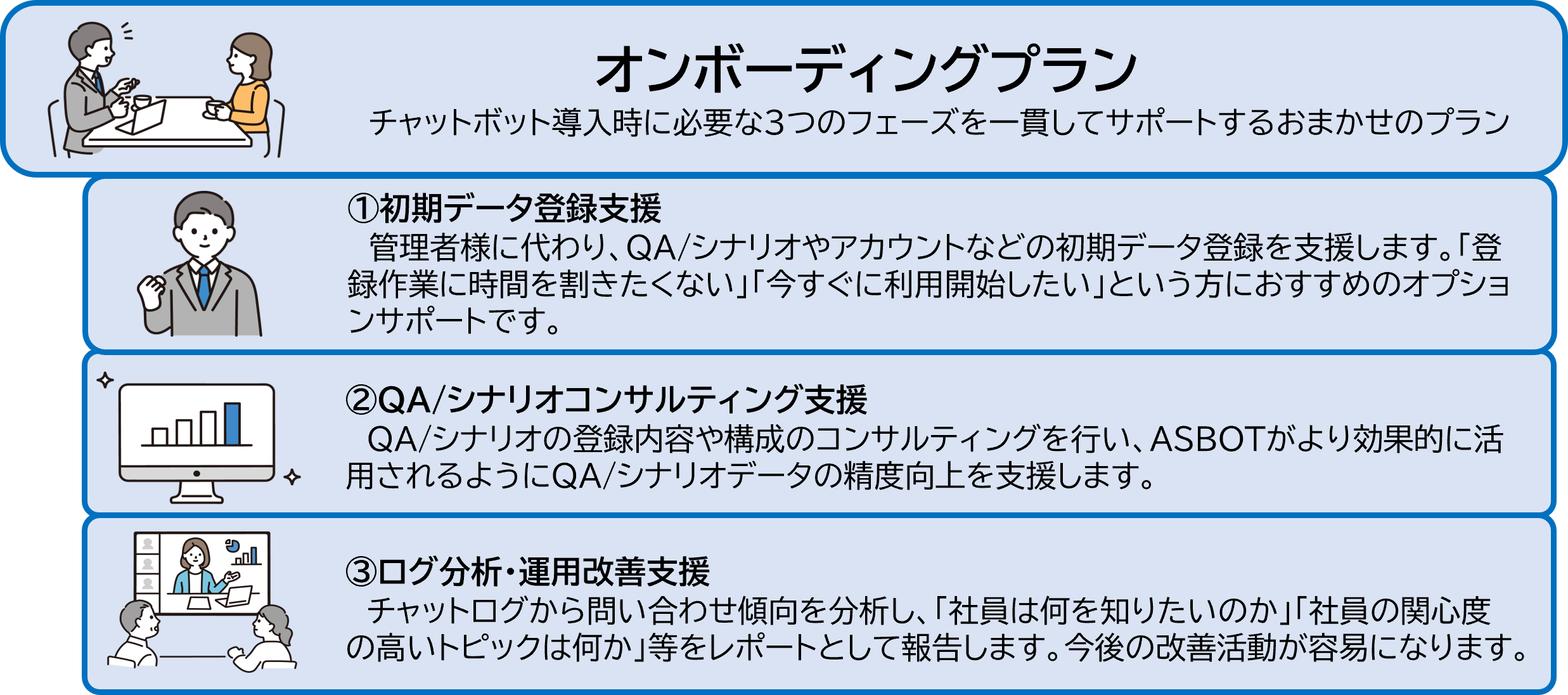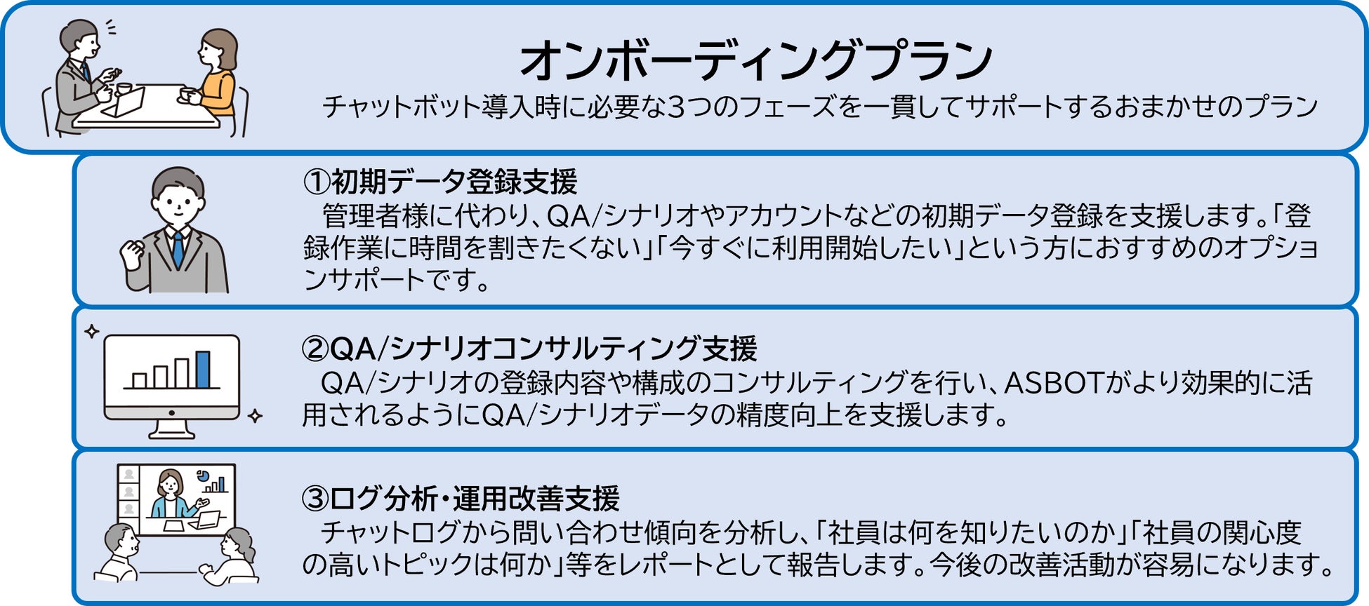 | サービス名 | ①支援サービス:オンボーディングプラン ②機能強化:ASBOT 「問い合わせ一覧機能の追加・QAカテゴライズ区分の追加」 |