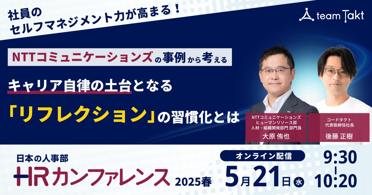 株式会社コードタクト(本社:東京都渋谷区、代表取締役:後藤 正樹、以下「当社」)は、2025年5月21日(水)に開催される「HRカンファレンス2025春」にて、NTTコミュニケーションズ株式会社(以下「NTTコミュニケーションズ」)ヒューマンリソース部 人材・組織開発部門 部門長の大原侑也氏と、当社 代表取締役の後藤正樹による講演「NTTコミュニケーションズの事例から考える キャリア自律の土台となる『リフレクション』の習慣化とは」を行います。