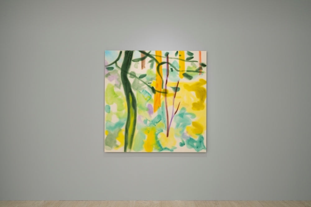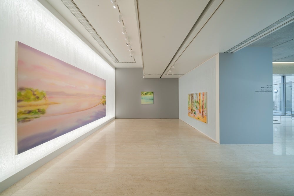 制作の過程においては「水」が極めて重要な役割を担いながら、丸山が水を意図的に絵画に描き始めたのは近年のことです。水面を描いた作品群に加えて、本展ではこの箱根・仙石原の地をテーマに、当館を取り囲む豊かなヒメシャラの森の取材から生まれた新作を展示しています。