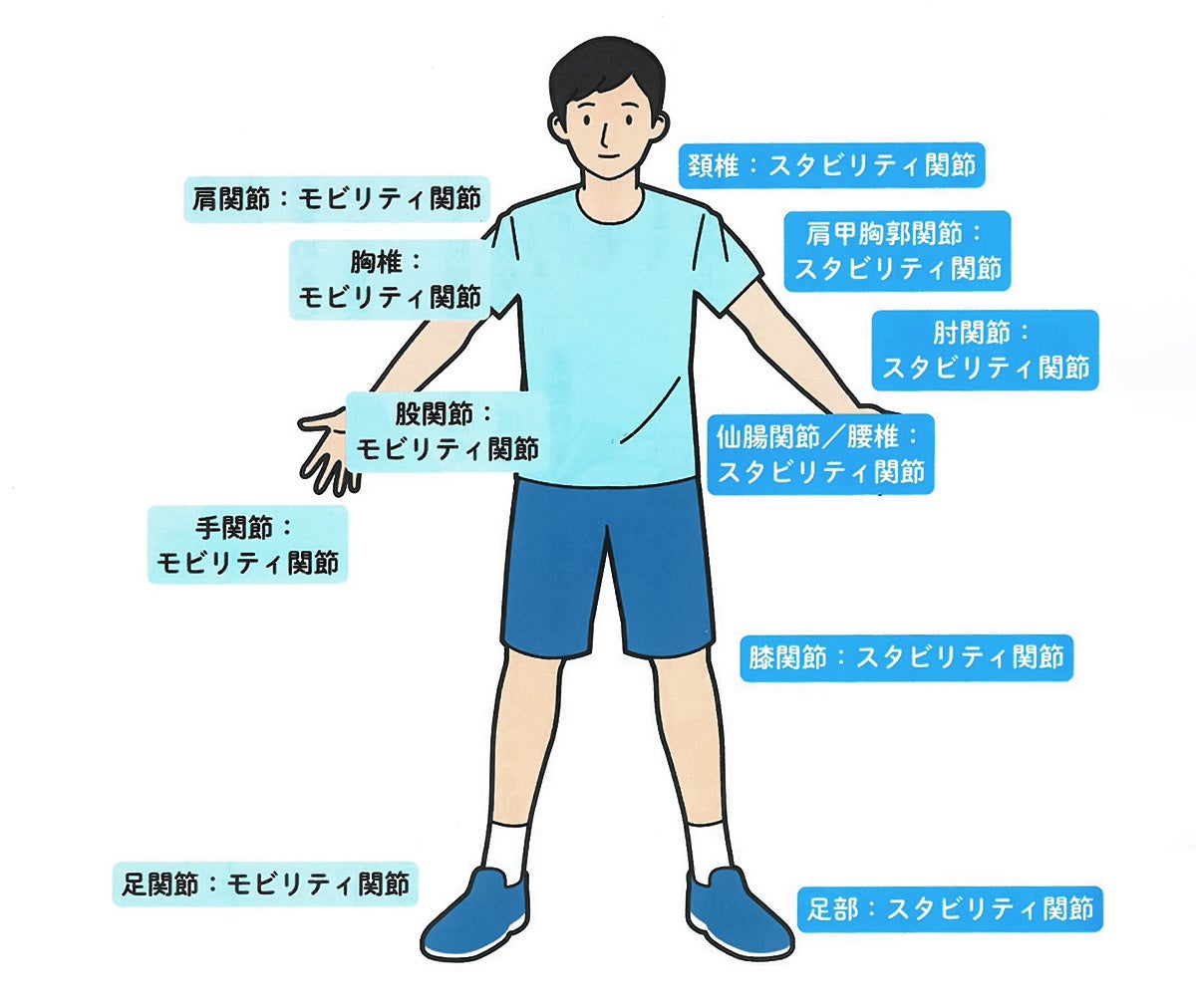 アメリカのストレングス&コンディショニングコーチであるマイケル・ボイル氏と、理学療法士であるグレイ・クック氏によって考案された、人間の体は足部の関節からサンドイッチ状に「スタビリティ(安定性を求められる)関節」と「モビリティ(動きが求められている)関節」で成り立っているというジョイント・バイ・ジョイント理論に基づくアプローチです。痛みのある箇所ではその部位ばかりに目を向けるのではなく、患部周辺の関節(特にモビリティ関節の動きやスタビリティ関節の安全性)に目を向けることが重要になってきます。