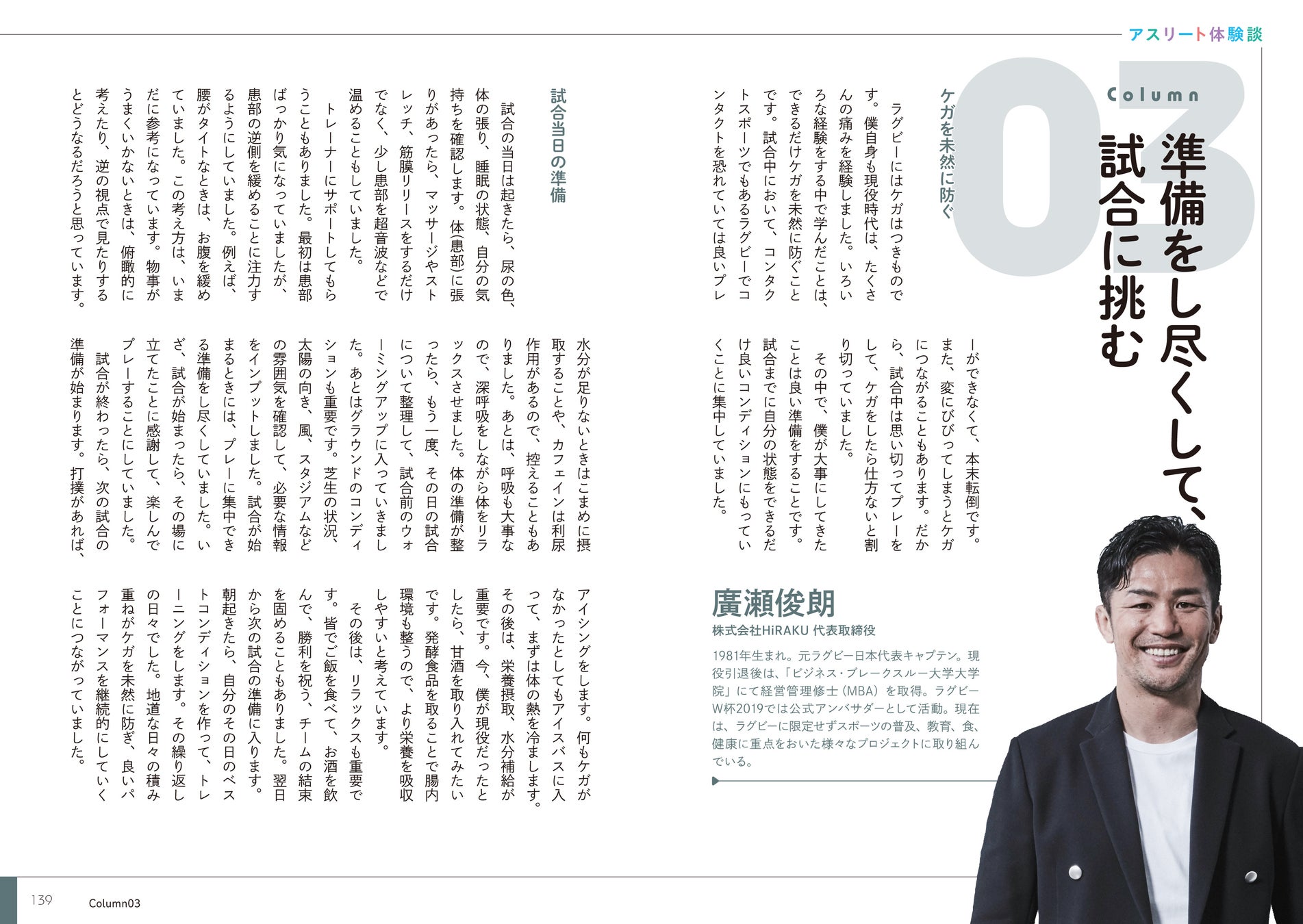 本書では、元・バスケットボール日本代表 三谷藍さん、元・バレーボール日本代表 加藤陽一さん、元・ラグビー日本代表 廣瀬俊朗さん、元・フェンシング日本代表 千田健太さんが、現役時代に自分の体をどのように管理したのか、ケガを予防するために行ってきたことやトレーナーとともに何に留意したのかについてを紹介しています。