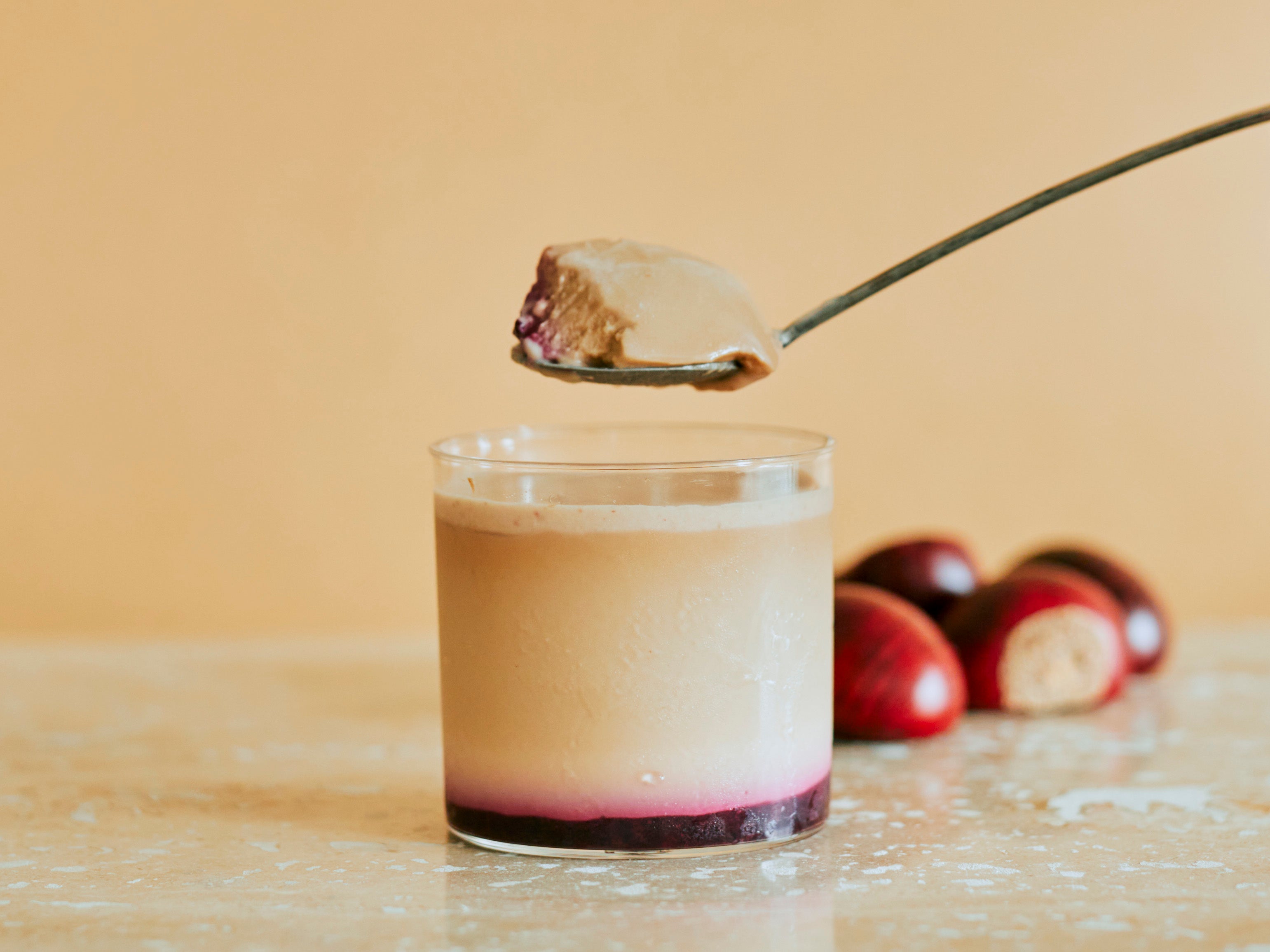 栗の香ばしさや重めのフローラル感と相性の良い、キャラメルテイストを持つ深いミルクチョコレートを合わせたプリン。底にはカシスのジュレを入れました。