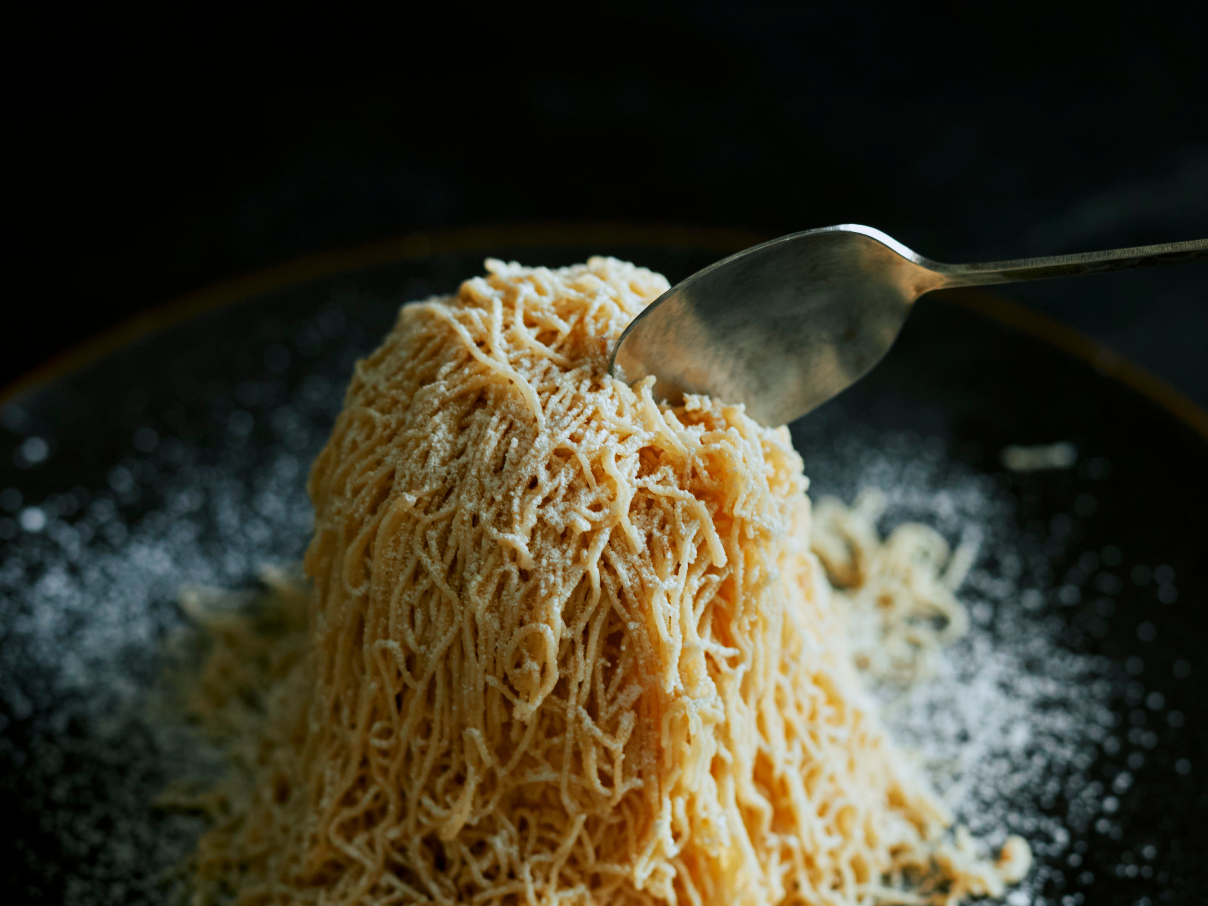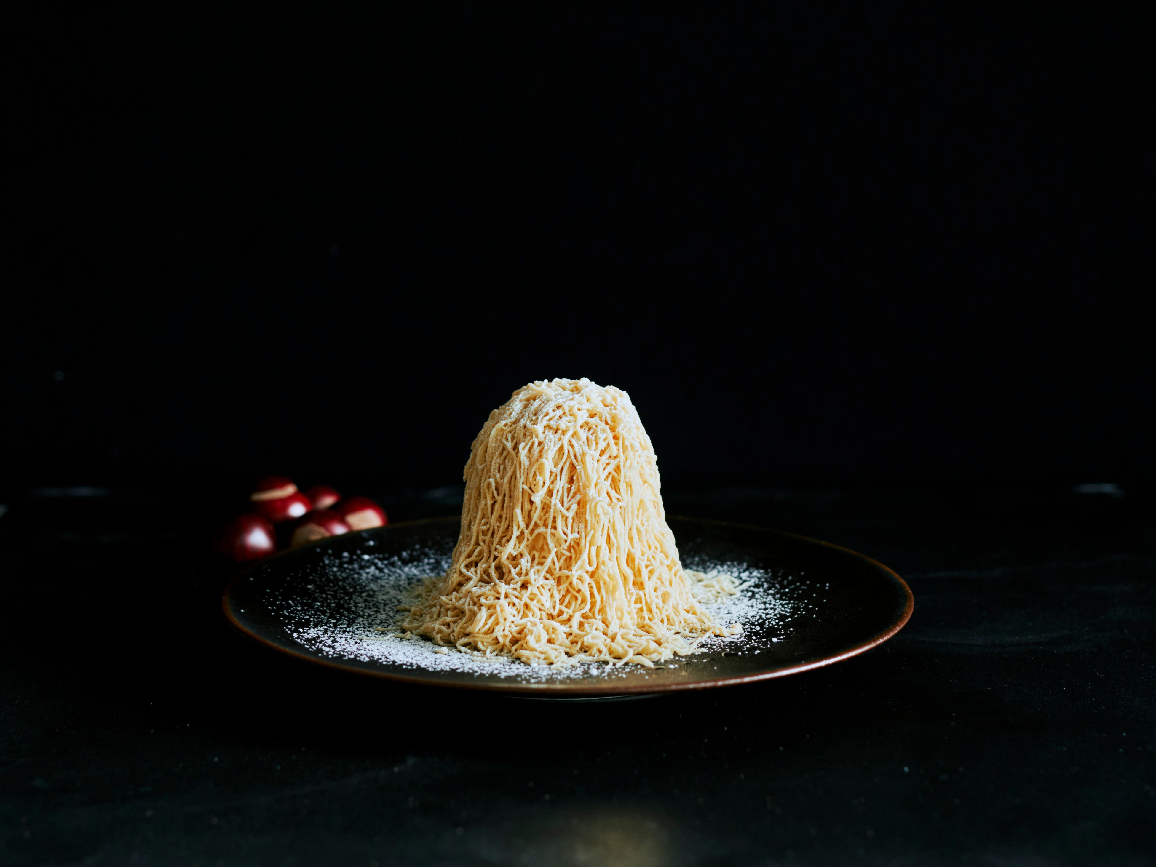 「栗そのものよりも栗を味わえるモンブラン」をコンセプトに、山鹿の和栗、生クリーム、カカオビネガーのシンプルな材料で作った一品。栗の王様とも称される味の濃い和栗を収穫から1ヶ月間、0℃で熟成させることで糖度を一気に上げ、甘みと旨みを引き出しました。中にはカカオの果実部分で作ったフルーツビネガーを加えた、すっきりフローラルな香りの生クリームを忍ばせています。搾りたての栗のペーストと生クリームで賞味期限はわずか3分!崩れる前にお召し上がりください。