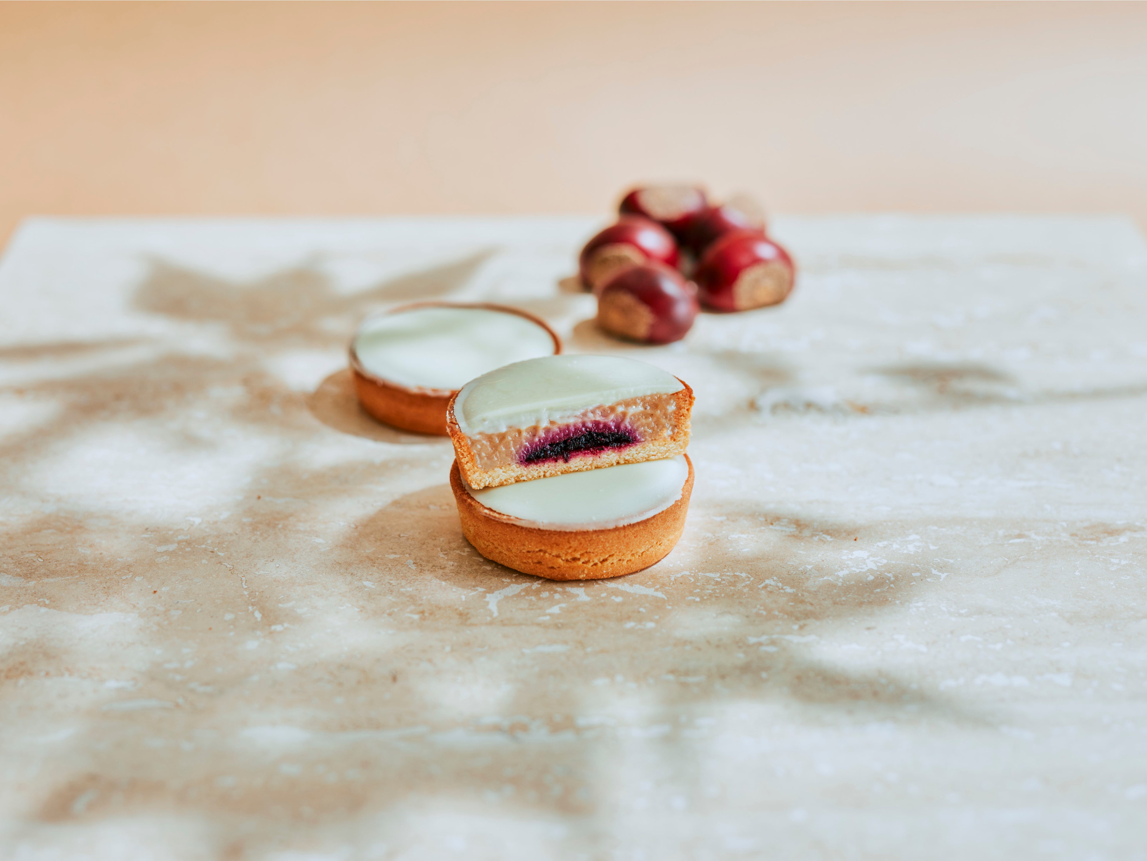 シンプルな美しさにこだわりながらも、味わいと食感を4層で作り込んだ一品です。手焼きのタルト生地に酸味の効いたカシスのピューレを敷き、山鹿の和栗とホワイトチョコレートを合わせた滑らかなクリームを流し入れました。最後に表面をコーティングし、香りを閉じ込めています。