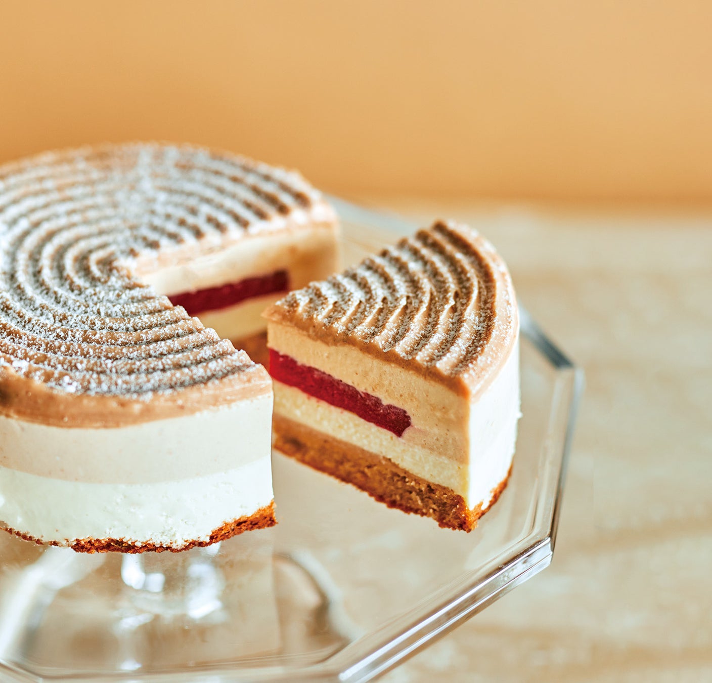 毎月メゾンカカオの誕生日25日に登場する、月替わりのショコラティエのおすすめケーキ、「MAISON SPÉCIALITÉ」。9月は和栗独特の深い甘みとフローラルな香りをチョコレートと合わせた、モンブラン・ショコラが限定登場します。ケーキの土台となるのは和栗のペーストとアーモンドクリームを合わせ、渋皮栗を乗せて焼きあげたもの。上は5層仕立てで、食感の良い生地に合わせた滑らかなムースとなっています。濃厚な和栗のペースト、ラムを効かせた華やかなホワイトチョコレートのムース、アクセントのフランボワーズのジュレ、和栗と渋皮栗をブレンドした栗のムースを重ねました。最後に渋皮栗と和栗のペーストを合わせたクリームを絞り、モンブランに仕立てました。