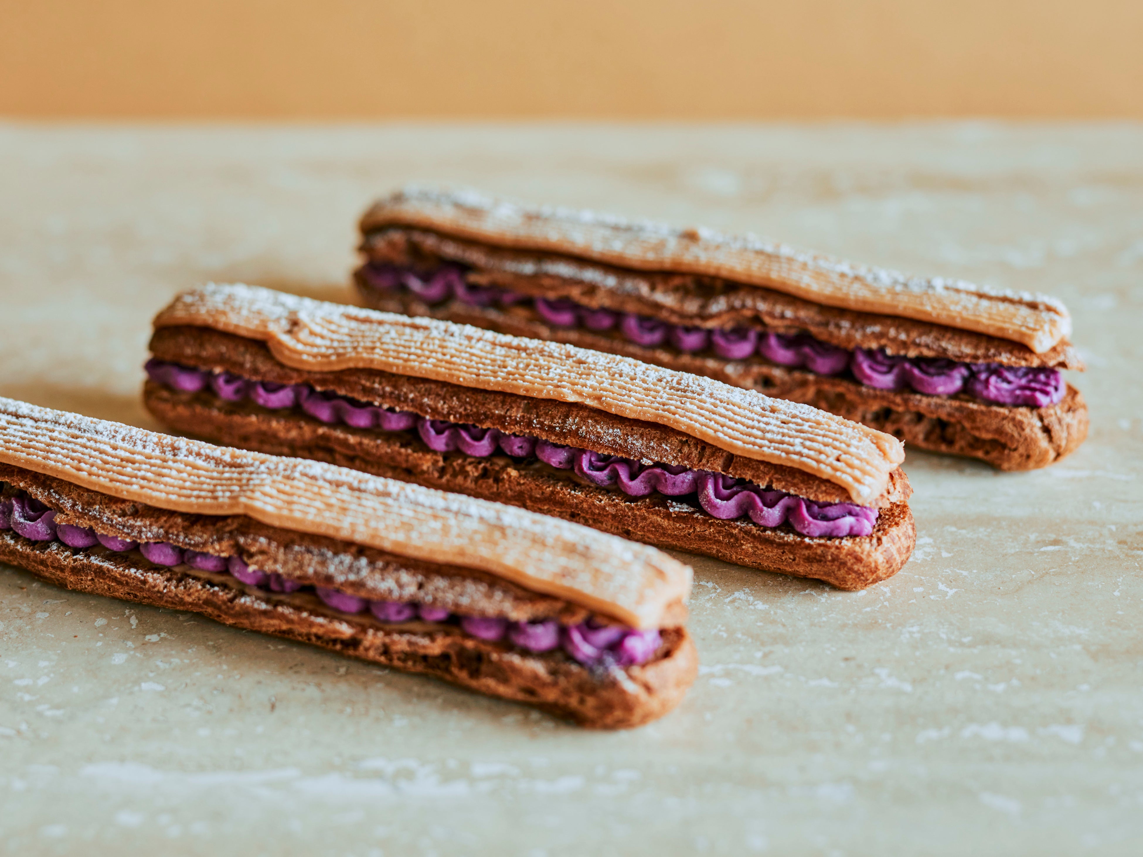 山鹿産の熟成和栗とフランス産の洋栗の2種を味わえるモンブランエクレア。シュー生地の中は洋栗をペーストしたクリームと、カシスとホワイトチョコレートを合わせた紫色のガナッシュをサンド。熟成和栗そのものも大きくカットして入れました。栗本来の風味と深い甘みがカシスの酸味で引き立ちます。