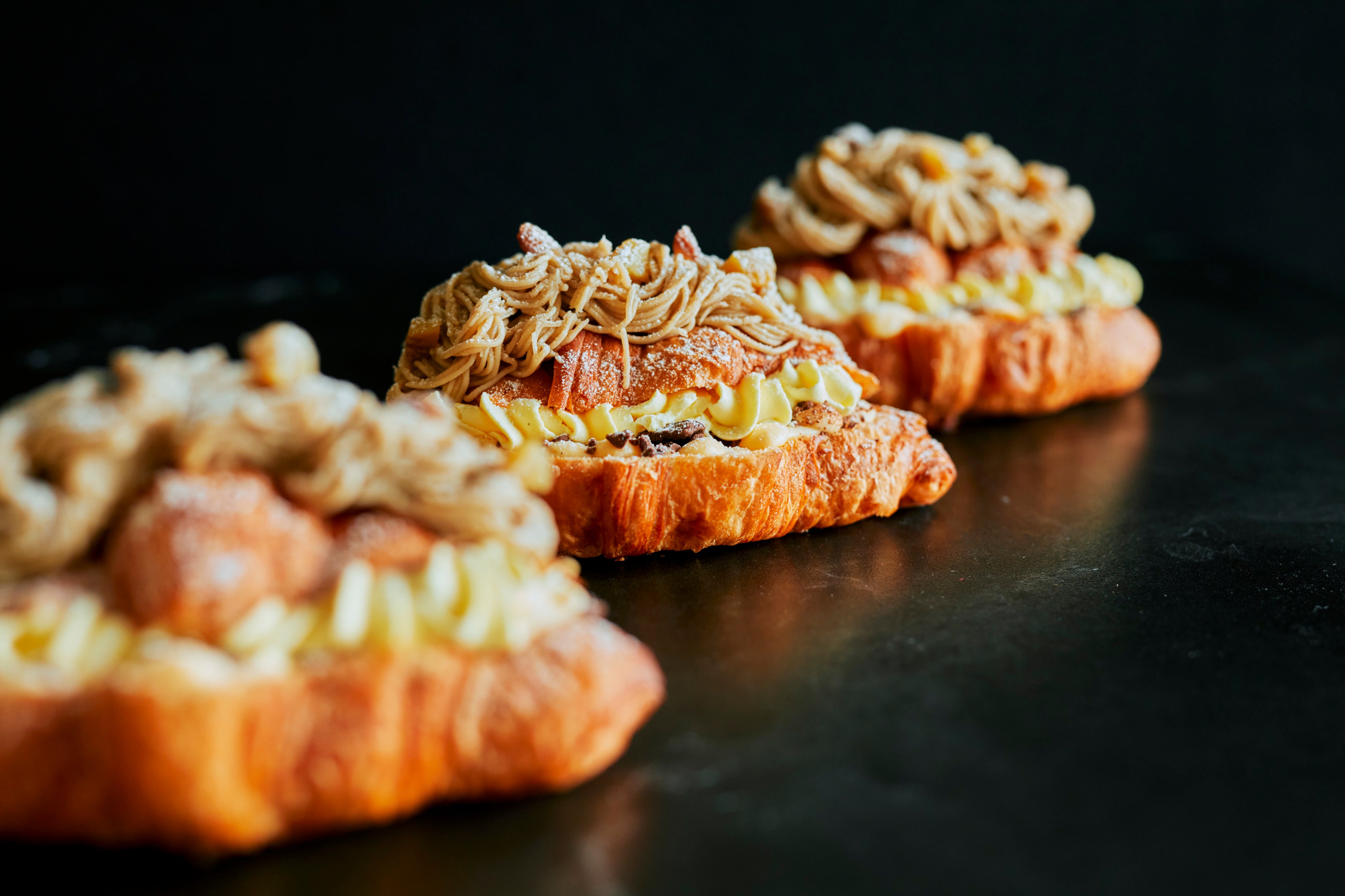国産の発酵バターを使用し、あえて8層仕立てで軽やかな食感を出したクロワッサンの中に、下からカスタード、花のような香りを持つビターチョコレート、山鹿の和栗の生クリームを重ね、上には和栗のモンブランを絞り、和栗の甘露煮を載せました。ケーキのような贅沢なデザートクロワッサンです。