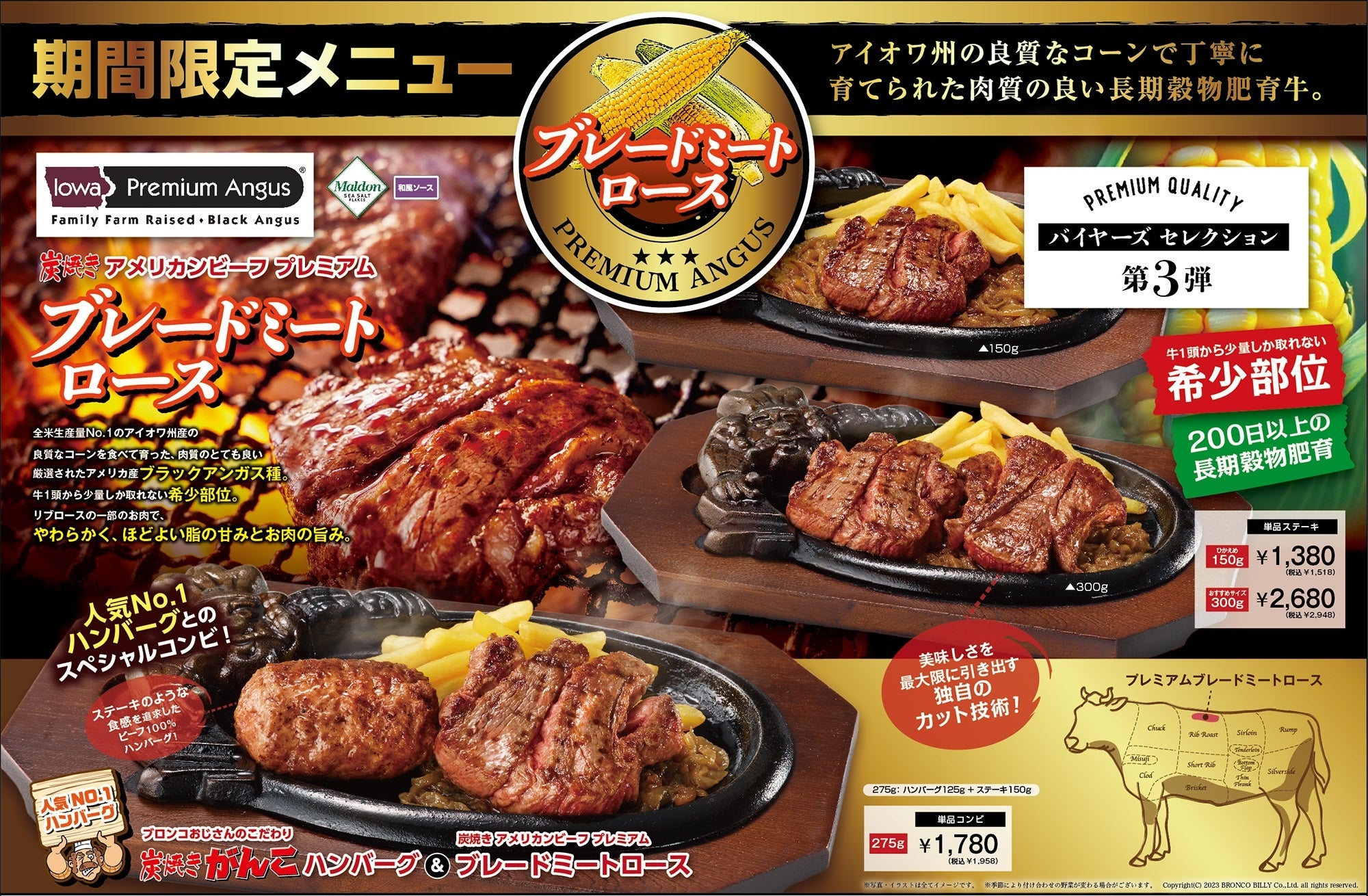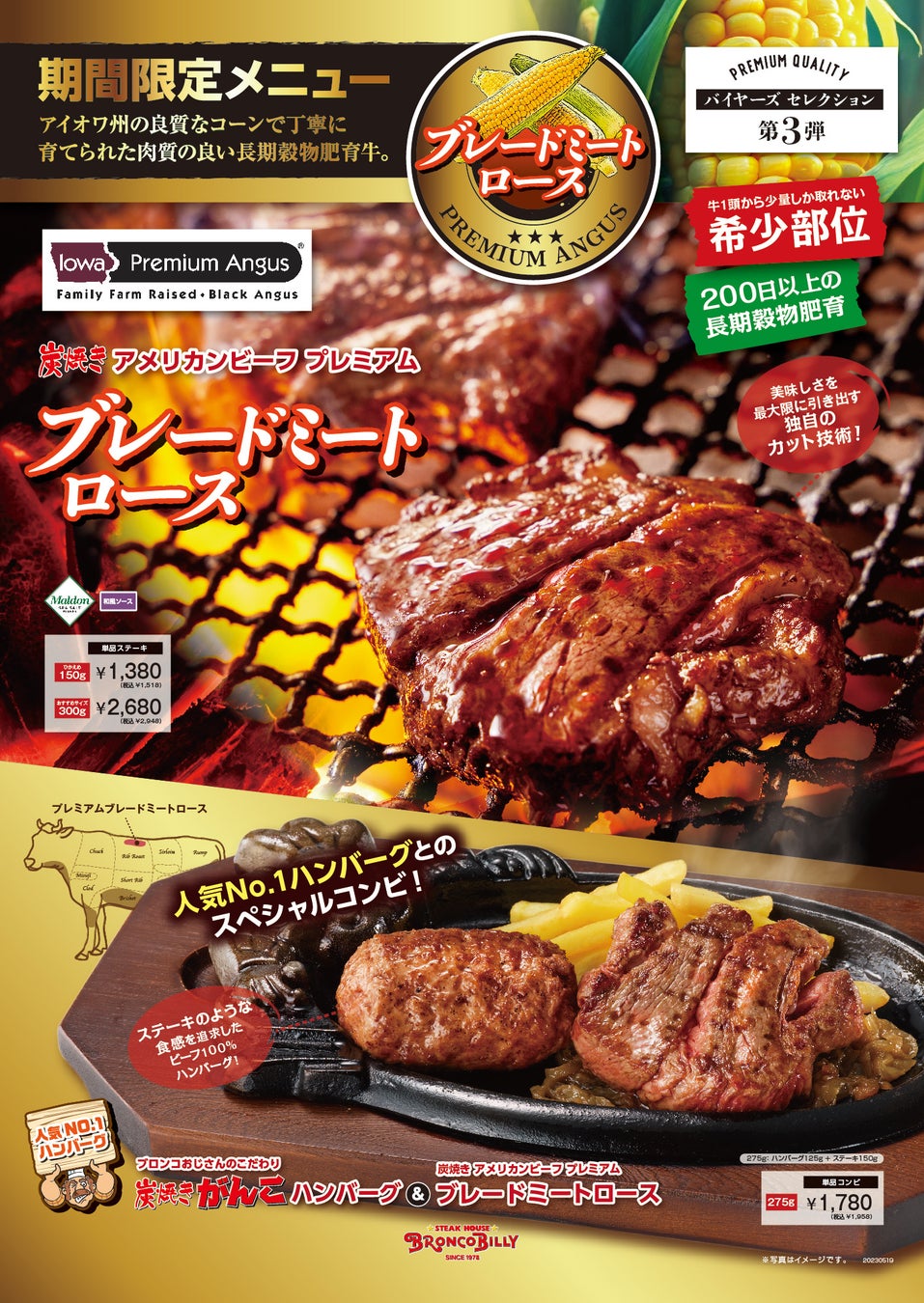 5月19日(金)より開始する第3弾には、噛みしめるほどに濃厚な肉の旨みが広がる『炭焼き アメリカンビーフプレミアム ブレードミートロース』をご用意しました。味の決め手は、収穫量全米No.1・アイオア州の良質なコーン。そのコーンをたっぷり食べ丁寧に育てられた牛は、ほどよくサシが入りやわらかく、コクがあり味わい深いのが特徴です。さらにブロンコビリーこだわりの炭焼きにより、外はカリっと中はジューシーに焼き上げます。