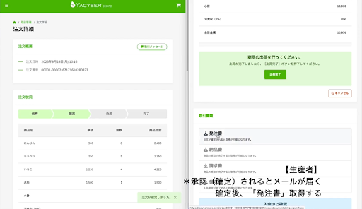 本システムについては、コンタクト機能のみならず「発注書」「納品書」「請求書」「領収書」の発行も可能です。販売者からの注文については登録したメールアドレスへ内容が自動送信され、農園での作業中または出張先でも簡単に確認することができます。万が一、農産物の収穫状況が追い付かない場合もその場で販売者へ連絡することが可能なため、負担なく問題を未然に防ぐことができます。