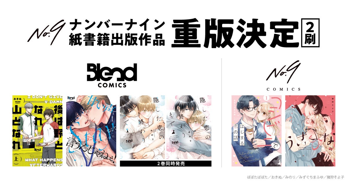 第一弾となる5作品はいずれも発売直後からデジタルでの注目度とリアル書店の期待感が合致し、多くの読者の皆様にご好評をいただきました。 発売後、まずBLレーベル「Blend Comics」の3作品(『甘い声でStayなんて言うんじゃねぇ!(1)』、『後は野となれ山となれ(上)』、『隠した恋の終わりまで(1)、(2)』)の重版が決定し、このたび新たに『コンビニではじまる恋の話(1)』、『うさひな -5年付き合ってる大学生カップルの話-(1)』の重版も決定いたしました。 これにより、第一弾として刊行した全5作品の重版が決定いたしました。