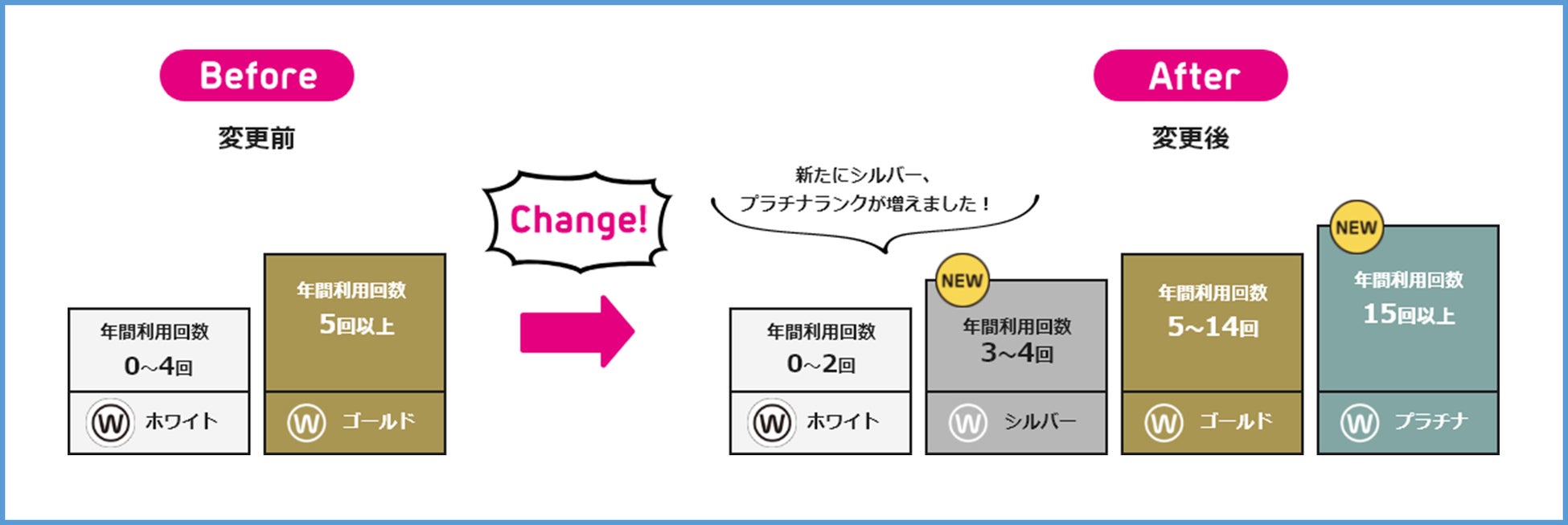 リニューアル前の会員制度は、「ホワイトランク」と「ゴールドランク」の2段階で、新たな会員制度では「シルバーランク」と「プラチナランク」が追加され4段階になります。年間利用回数0〜2回の「ホワイトランク」からスタートし、3〜4回の「シルバーランク」、5〜14回の「ゴールドランク」、15回以上の「プラチナランク」へとランクアップします。