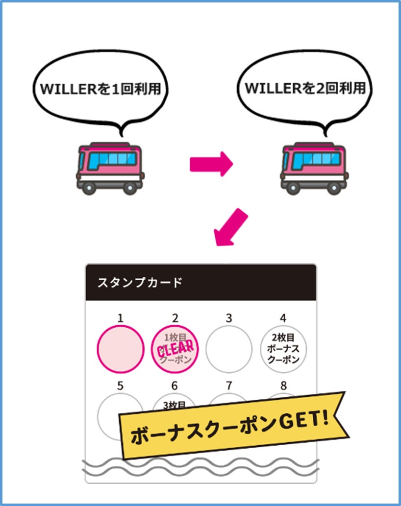 1回の利用でスタンプ1個が付与され、2個貯めるごとにWILLERサイトで販売する高速路線バスで利用いただけるボーナスクーポンが発行されます。