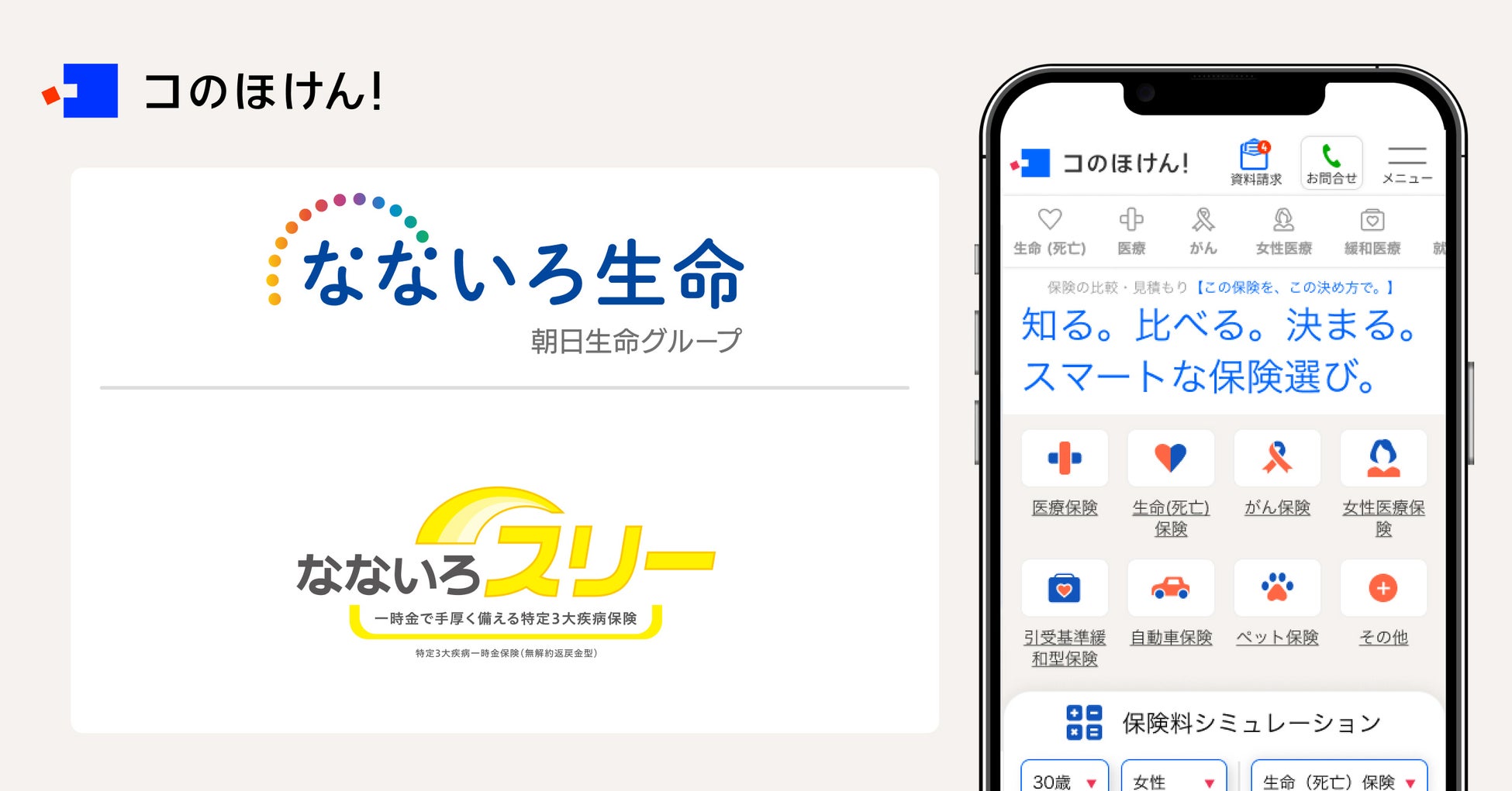 Sasuke Financial Lab 株式会社(本社:東京都千代田区、代表取締役:松井清隆、以下「当社」)が運営する保険の診断・一括比較・見積もりサイト「コのほけん!」( https://konohoken.com/ )において、なないろ生命保険株式会社(本社:東京都新宿区、代表取締役社長:石島健一郎、以下「なないろ生命」)の特定3大疾病一時金保険「なないろスリー」の取り扱いを開始しましたので、お知らせ致します。