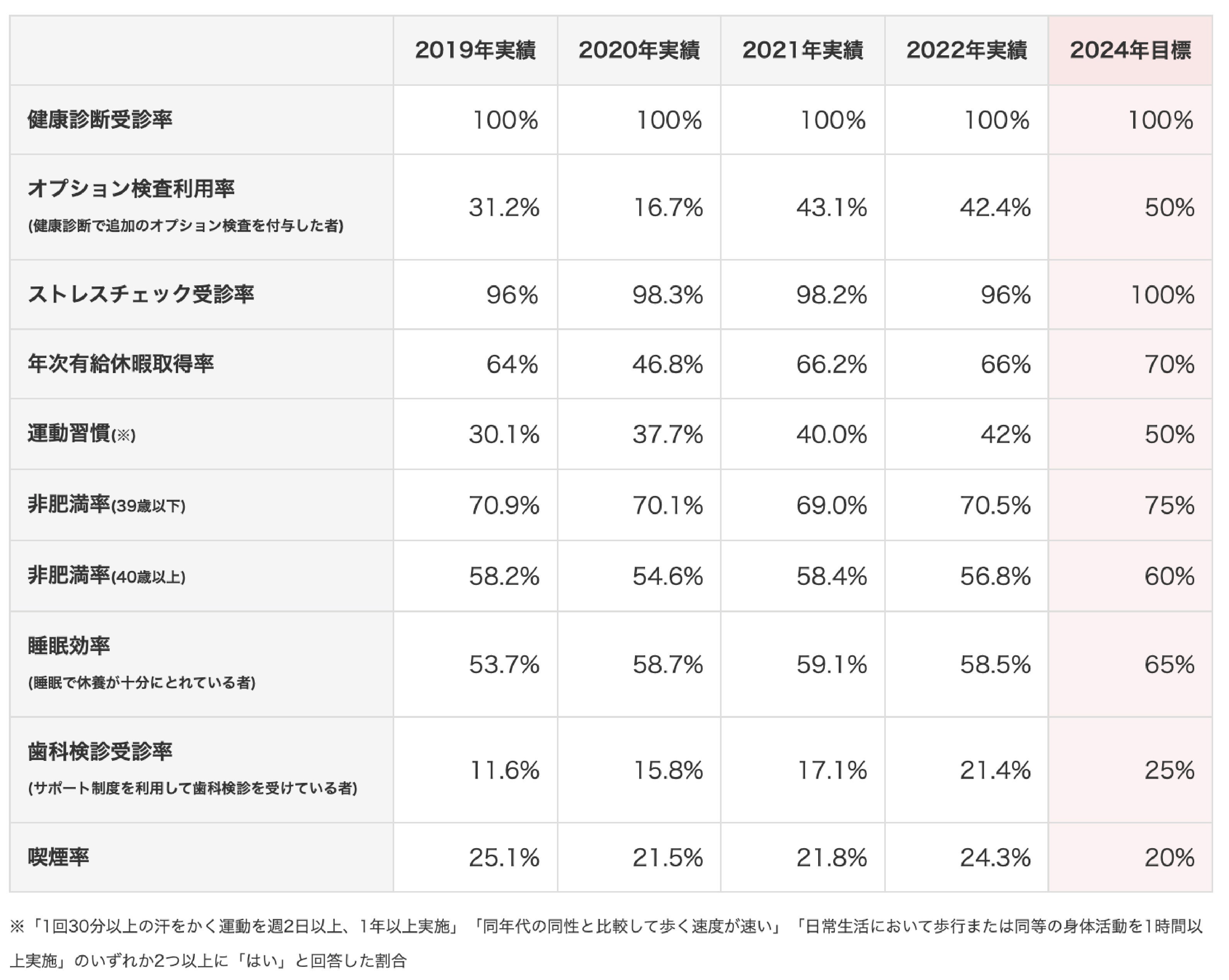 弊社では従業員へのアンケートをもとに、従業員の健康状態を把握、数値化しています。今後もこれらの指標を取り入れながら従業員の健康維持・増進に努めてまいります。