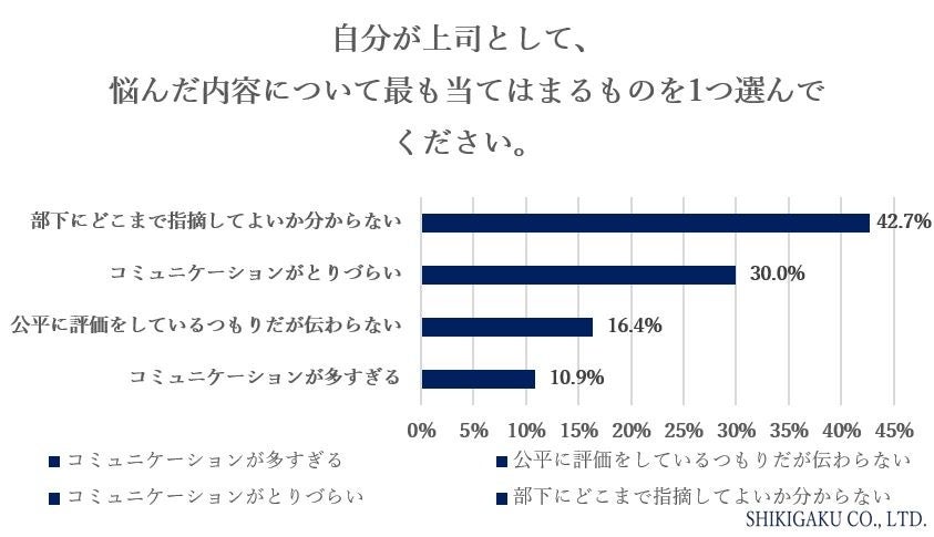 上司として悩んだ項目として最も多かったのは「部下にどこまで指摘してよいか分からない」で42.7%、次に「コミュニケーションがとりづらい」が30%となりました。特に指摘に関しては回答者の4割以上の方が悩んでいるという結果となりました。