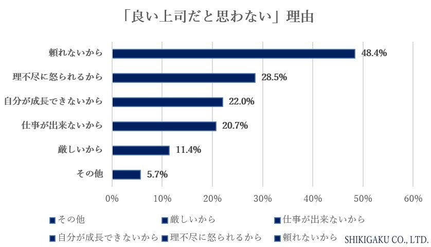 一方で「いい上司だと思わない理由」として最も多かったのは「頼れないから」で48.4%、次点に「理不尽に怒られるから」が28.5%、続いて「自分が成長できないから」が22%という結果になりました。