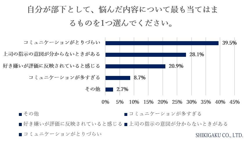 部下として悩んだ内容としてもっとも多かったのは「コミュニケーションがとりづらい」で39.5%、次いで「上司の指示の意図が分からないときがある」が28.1%と上位2項目で半数以上の回答が集まりました。