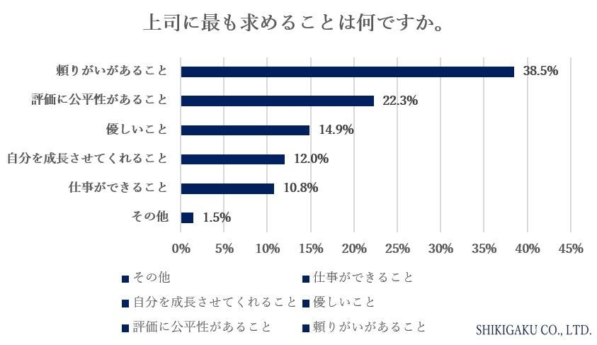 上司に最も求めることについては「頼れること」が第一位となり、全体の38.5%を占めました。続いて、「評価に公平性があること」が22.3%という結果でした。